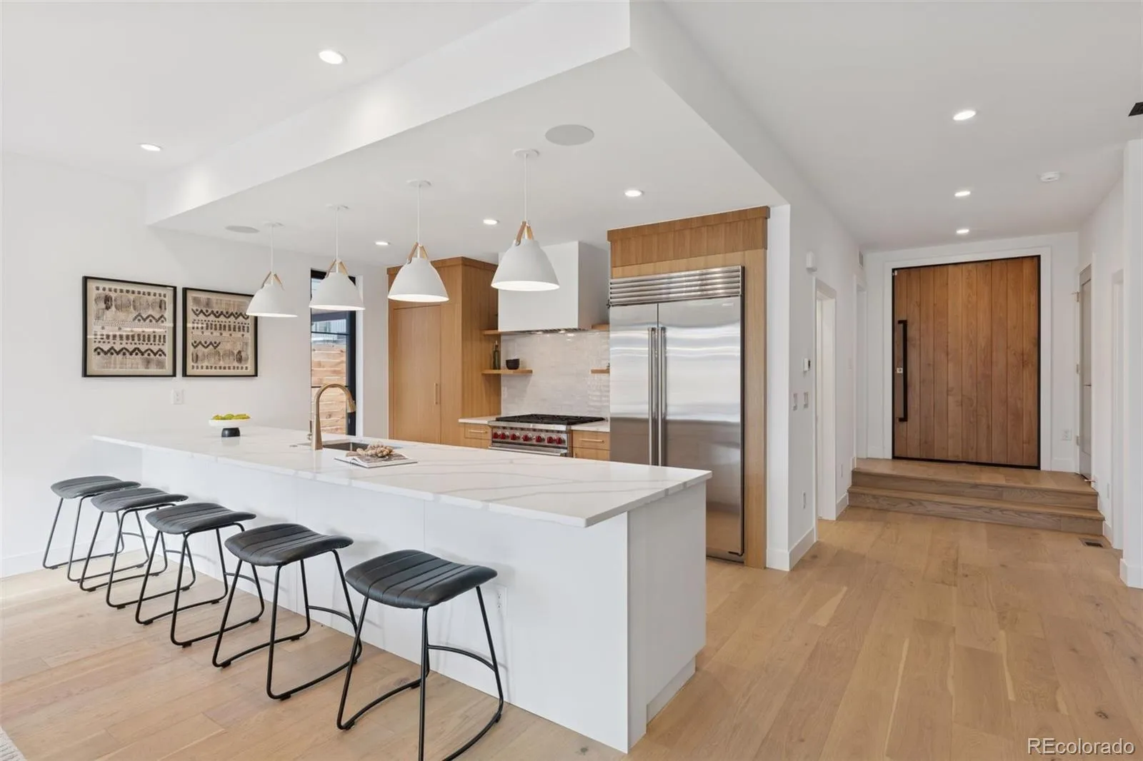 This exceptional 6-bedroom, 8-bathroom new construction home in North Boulder offers a perfect blend of modern design, functionality, and breathtaking indoor-outdoor living. With soaring ceilings and expansive windows, the home is flooded with natural light, while vast sliding glass doors create a seamless connection to the outdoors. The chef’s kitchen is a true centerpiece, featuring high-end Wolf and Sub-Zero appliances, sleek custom cabinetry, and an elegant dining space crowned by a contemporary chandelier. The main level offers incredible versatility with a private office and a separate bedroom with an attached ¾ bath, ideal for dual work-from-home spaces or a dedicated guest suite. A spacious mudroom with generous storage adds everyday convenience. Upstairs, the primary suite impresses with vaulted ceilings, a custom walk-in closet, and a spa-worthy bath. The top floor reveals a flexible space complete with a wet bar, powder room, and access to an expansive rooftop deck showcasing panoramic views of the Flatirons — perfect for entertaining or relaxing. The finished lower level provides additional living space with a gym, recreation area, and two guest suites. Outdoor living is equally impressive, with a fenced backyard, sprawling patio, and a detached two-car garage. Designed with semi-custom finishes, natural colors, and an airy, light-filled aesthetic, this home is a rare gem in the heart of North Boulder.