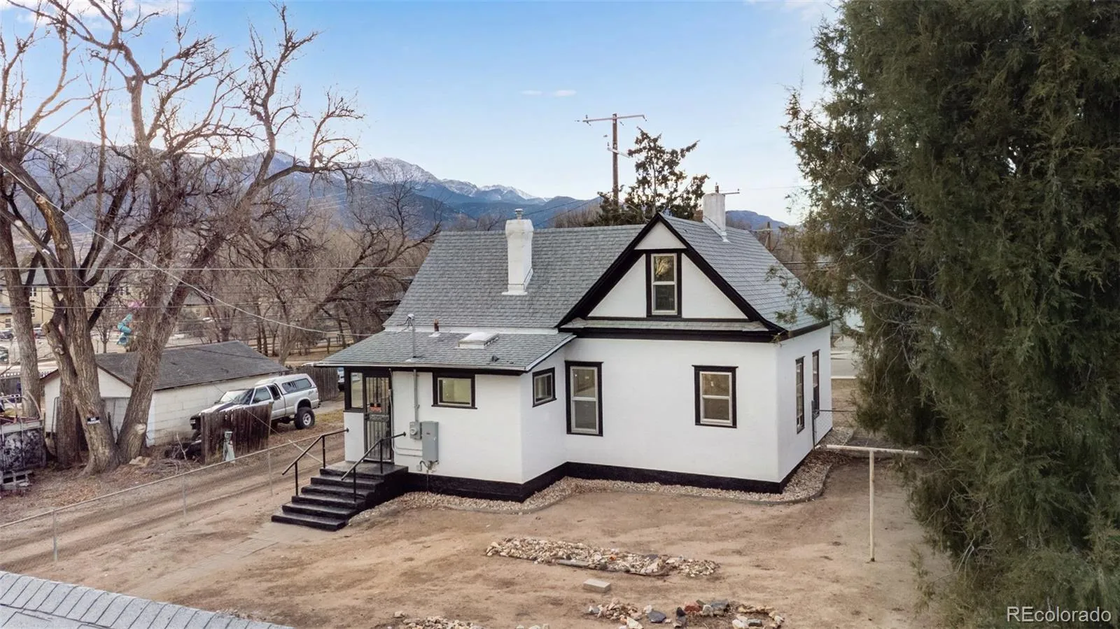 Other features include vinyl windows, updated mechanicals, a large covered front porch, detached garage, and two additional outbuildings. The home sits on a corner lot with mountain views and room to add RV parking, gardens, or even a secondary dwelling.