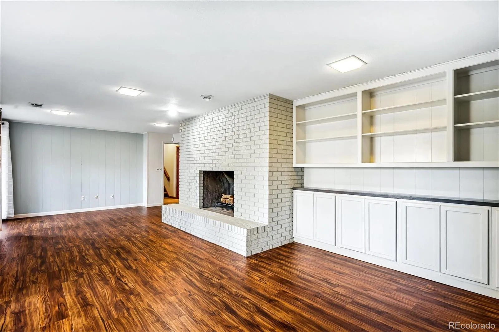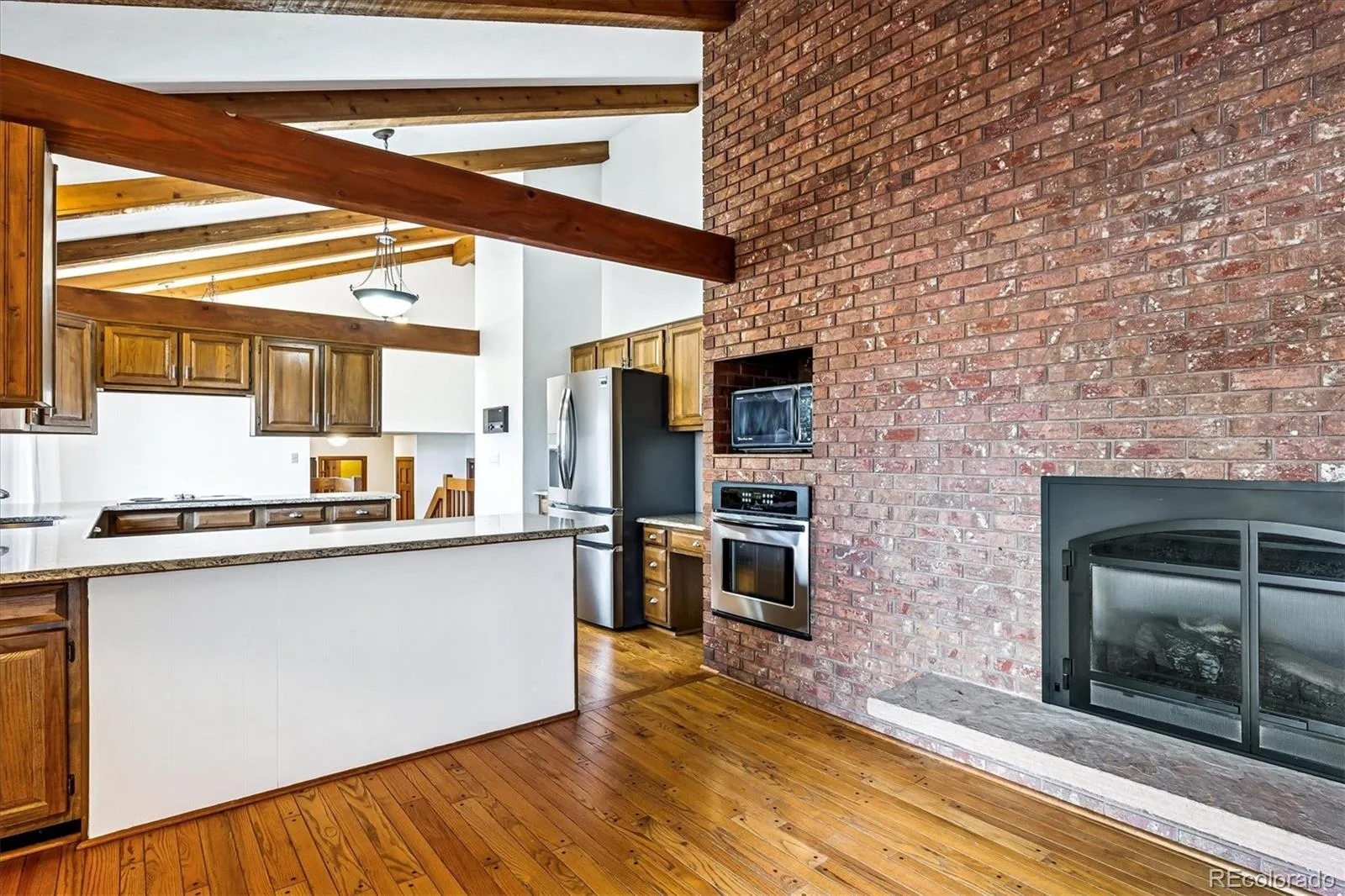 The living space flows into a well-appointed kitchen with an eat-in breakfast nook and continues seamlessly into the family room. Here, a large brick fireplace creates a warm gathering space, while windows frame serene views of the lush, tree-filled backyard—ideal for both everyday living and entertaining.