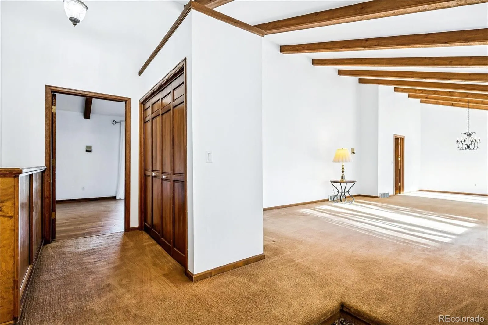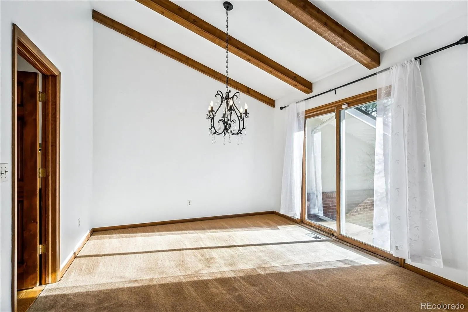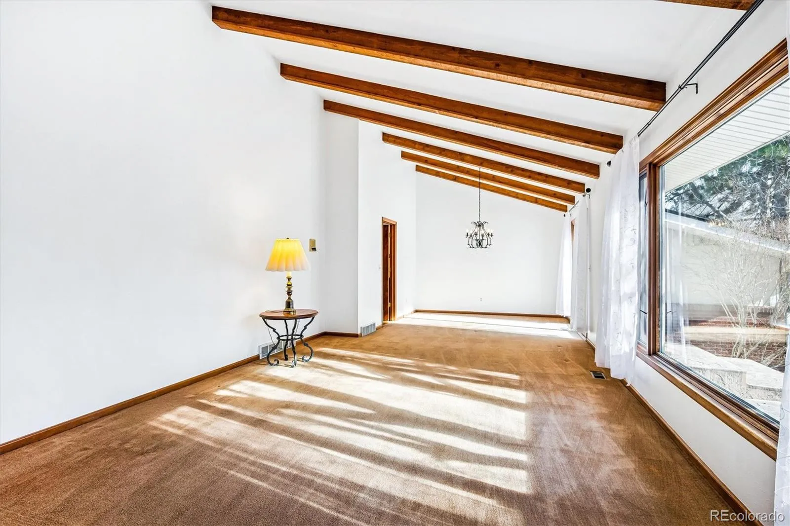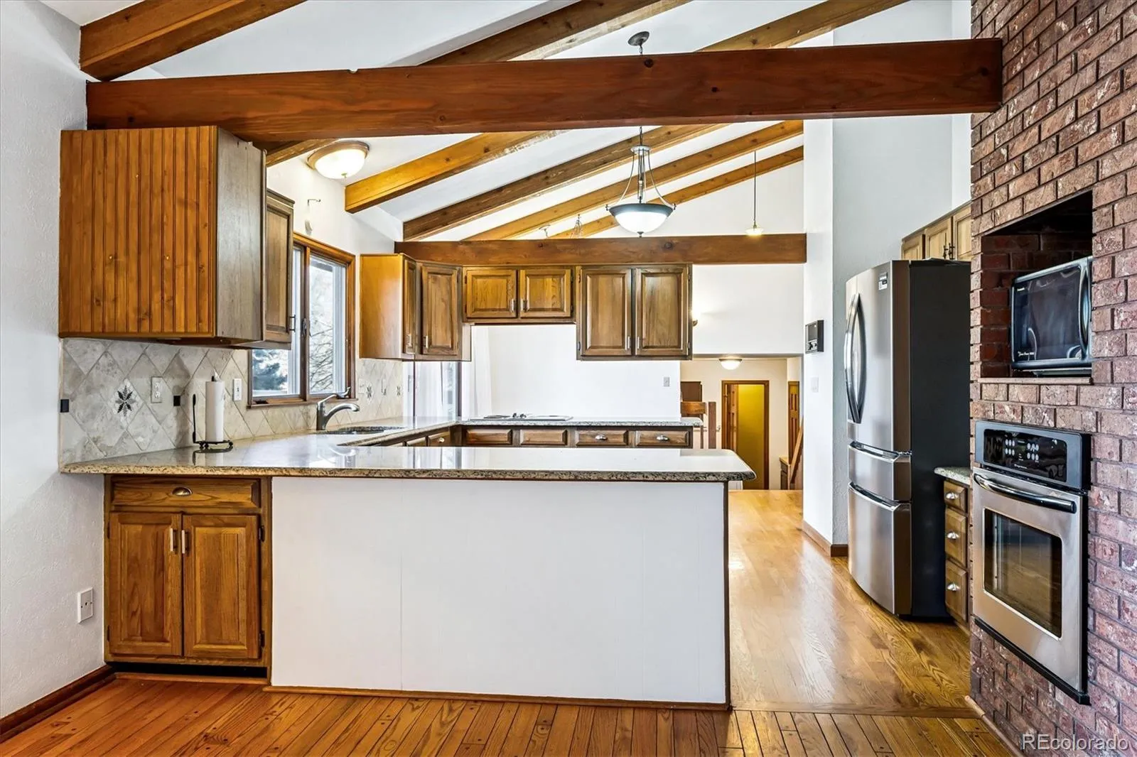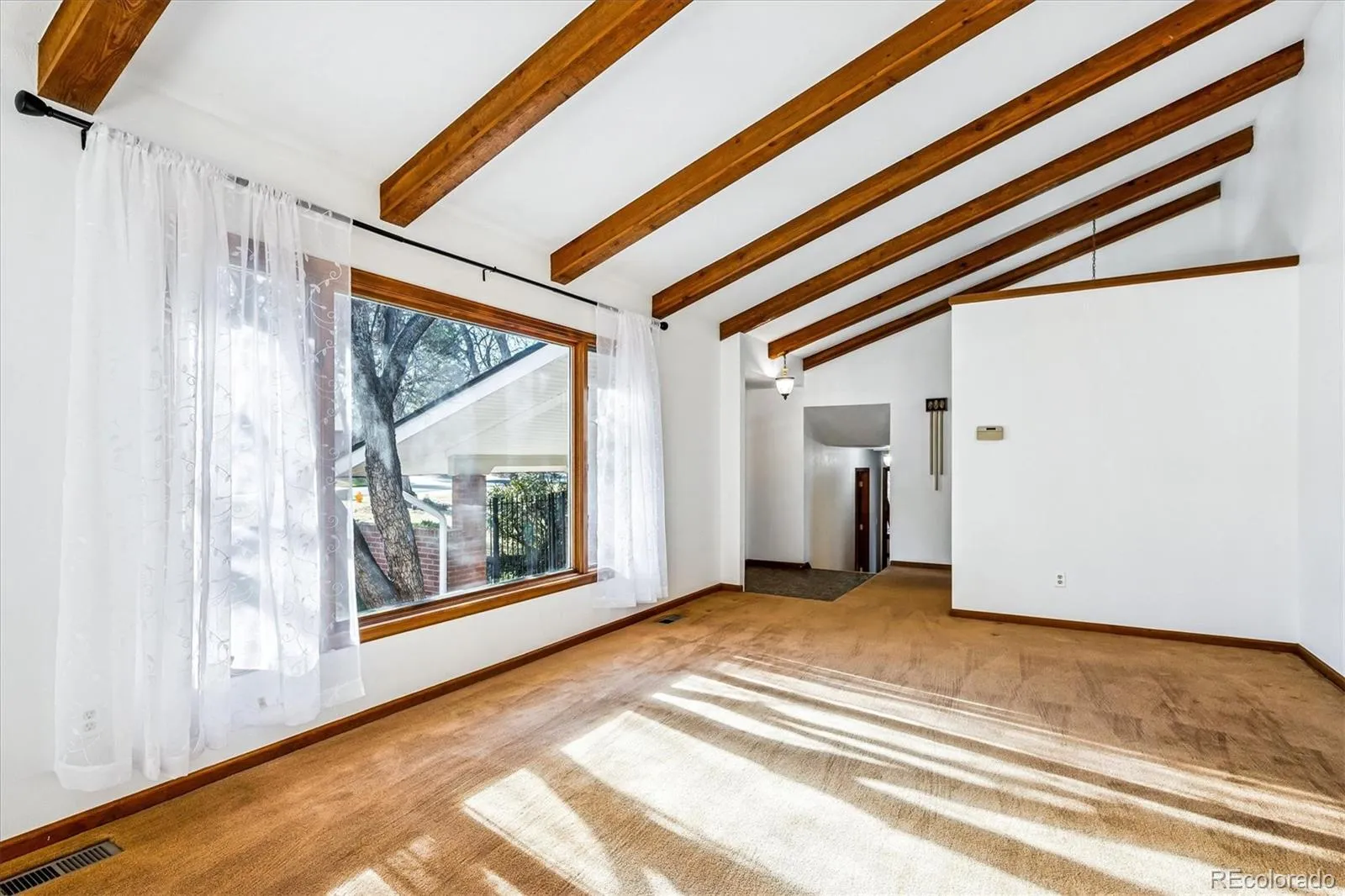 Nestled on an expansive over half-acre lot in the heart of Columbine Heights, this impressive split-level home delivers exceptional space, privacy, and versatility with a well-designed, multi-level floor plan. The entry opens to a bright living and dining area featuring vaulted ceilings with beautiful wood beams and large picture windows that look out to the front patio, creating a welcoming courtyard feel.