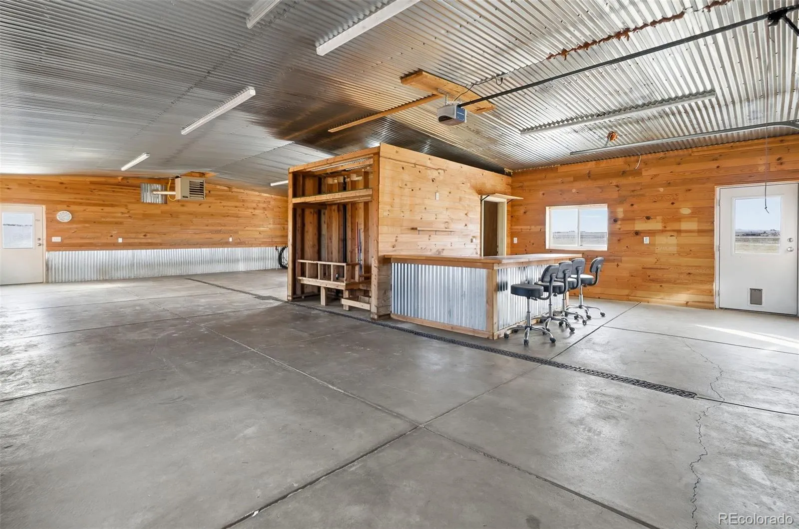 A heated outbuilding, originally designed as a kennel, features a sealed concrete floor with full-length wrought-iron trench drain for easy cleaning, a partially completed dog washing station with existing plumbing and framing, and a office area plumbed for an another bathroom.
