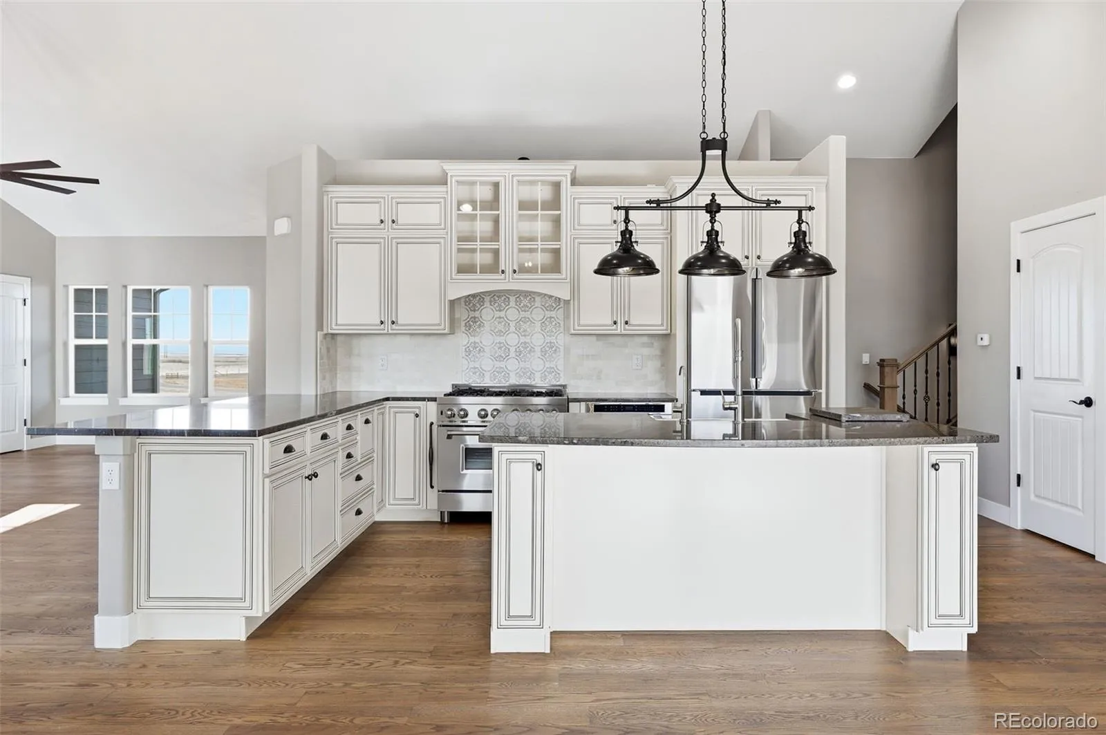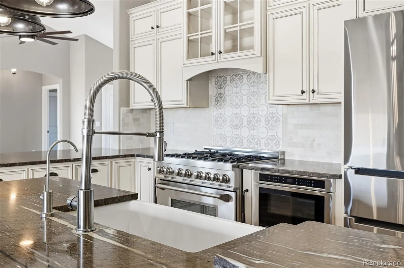 At the heart of the home is a gourmet kitchen equipped with a large granite island, whitewashed soft-close cabinetry, ZLINE professional stainless range, Bosch appliances, farmhouse sink, and custom tile backsplash—perfect for daily meals or entertaining.