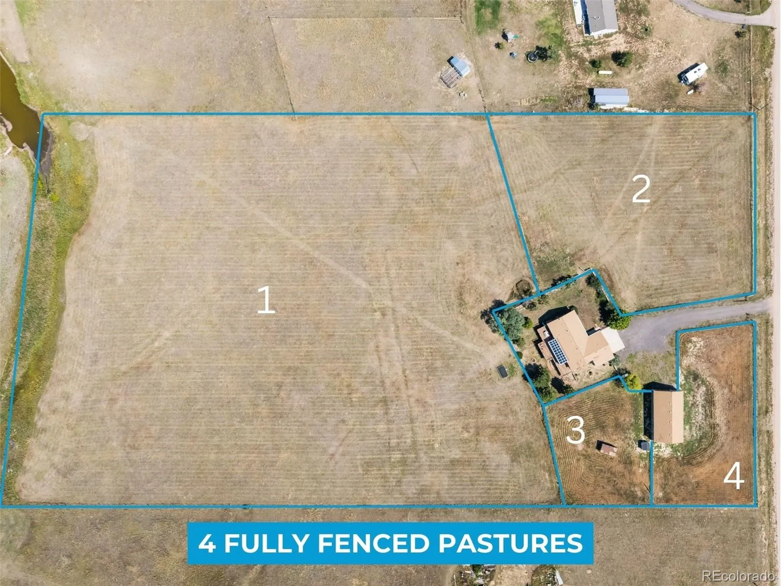 Newly remodeled farmhouse w/ mother in law quarters and large barn! Set against wide-open Colorado skies on 10 private acres, this beautifully updated ranch delivers the rare combination of refined interiors, usable land & jaw-dropping mountain & meadow views in every direction. From sunrise to golden-hour sunsets over the buttes, the setting feels peaceful & secluded while remaining conveniently close to Castle Rock, Monument & I-25 for easy access to dining, shopping & daily essentials. Inside, the home unfolds w/ light-filled spaces & a thoughtfully designed open layout that feels both warm & refreshed. The remodeled kitchen anchors the main level w/ crisp quartz countertops, a statement island, modern cabinetry & stainless appliances, flowing effortlessly into the living & dining areas where oversized windows & a fireplace frame the surrounding landscape. A sunroom wrapped in glass offers panoramic views & opens directly to outdoor living spaces. The primary suite is a true sanctuary, featuring a completely renovated five-piece bath w/ soaking tub, expansive walk-in shower & elevated finishes that rival a luxury spa. Bedrooms on the main floor are generously sized, while the fully finished walkout lower level offers exceptional flexibility w/ a private entrance, full second kitchen, guest bedrooms & multiple living zones ideal for multigenerational living or long-term guests. Outdoors, the property is nothing short of extraordinary. Four fully fenced pastures, a spring-fed pond & irrigated meadows create a functional & picturesque homestead, while the impressive barn w/ stalls, water & power supports horses, livestock, hobbies or large equipment. Whether you envision weekend trail rides, evening gatherings around the fire pit, this property offers a lifestyle rooted in freedom, space & natural beauty. An additional two more barns & two more garages up to 3000 ft.² each, AND an ADU can be built on the property!