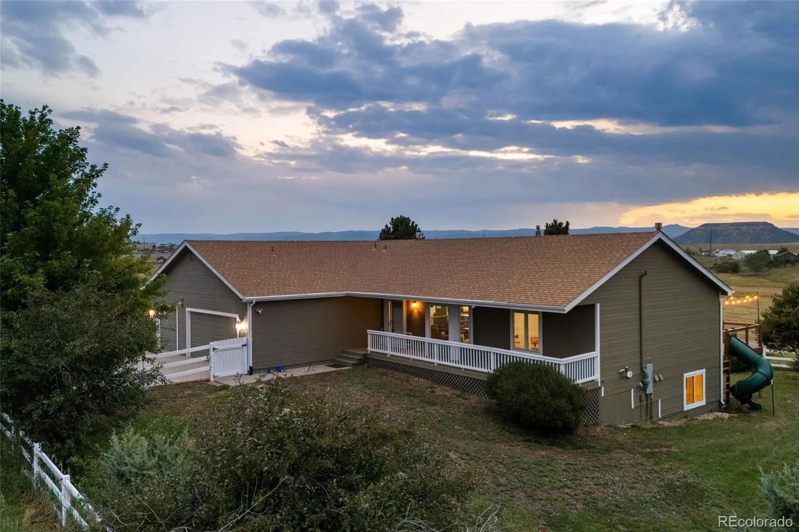 Newly remodeled farmhouse with mother in law quarters and large barn! Set against wide-open Colorado skies on ten private acres, this beautifully updated ranch delivers the rare combination of refined interiors, usable land, and jaw-dropping mountain and meadow views in every direction. From sunrise to golden-hour sunsets over the buttes, the setting feels peaceful and secluded while remaining conveniently close to Castle Rock, Monument, and I-25 for easy access to dining, shopping, and daily essentials. Inside, the home unfolds with light-filled spaces and a thoughtfully designed open layout that feels both warm and refreshed. The remodeled kitchen anchors the main level with crisp quartz countertops, a statement island, modern cabinetry, and stainless appliances, flowing effortlessly into the living and dining areas where oversized windows and a fireplace frame the surrounding landscape. A sunroom wrapped in glass offers panoramic views and opens directly to outdoor living spaces. The primary suite is a true sanctuary, featuring a completely renovated five-piece bath with soaking tub, expansive walk-in shower, and elevated finishes that rival a luxury spa. Bedrooms on the main floor are generously sized, while the fully finished walkout lower level offers exceptional flexibility with a private entrance, full second kitchen, guest bedrooms, and multiple living zones ideal for multigenerational living, or long-term guests. Outdoors, the property is nothing short of extraordinary. Four fully fenced pastures, a spring-fed pond, and irrigated meadows create a functional and picturesque homestead, while the impressive barn with stalls, water, and power supports horses, livestock, hobbies, or large equipment. Whether you envision weekend trail rides, evening gatherings around the fire pit, or soaking in the hot tub under a sky full of stars, this property offers a lifestyle rooted in freedom, space, and natural beauty — all within reach of Front Range conveniences.