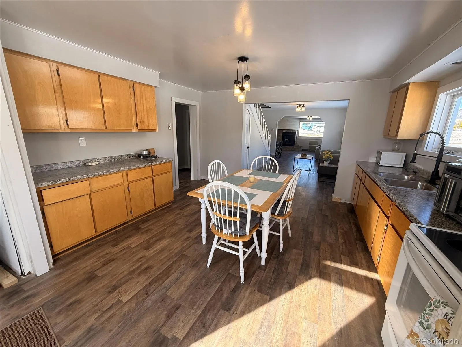 Bright and inviting in-town home situated on three city lots, offering a rare blend of recent updates, space, and future potential. The home features updated bathrooms, fresh paint, new windows, and updated flooring throughout, while still leaving room for a buyer to add their own finishing touches. The main level offers an open and comfortable flow from the living room to the dining area and kitchen, filled with natural light. A cozy stone fireplace anchors one of the living spaces, adding warmth and character. The kitchen provides ample cabinetry, counter space, and room for everyday dining. Convenient main-level laundry adds to the functionality of the home. Upstairs offers additional flexible space suitable for bedrooms, office, or bonus use. The concrete basement provides extra storage and utility space. One of the standout features of this property is the oversized four-car garage, along with ample outdoor space for parking, storage, and all your mountain toys. With four city lots, there may be potential to subdivide and sell one lot (buyer to verify). Located right in town, this property offers space, versatility, and convenience — a great opportunity for full-time living, investment, or future expansion.