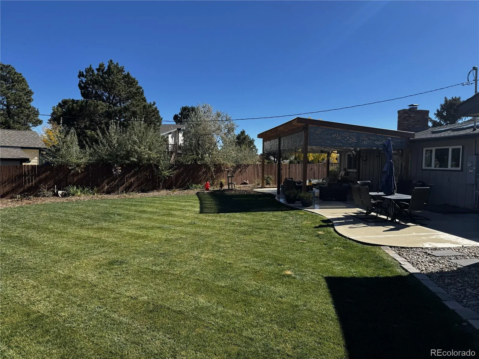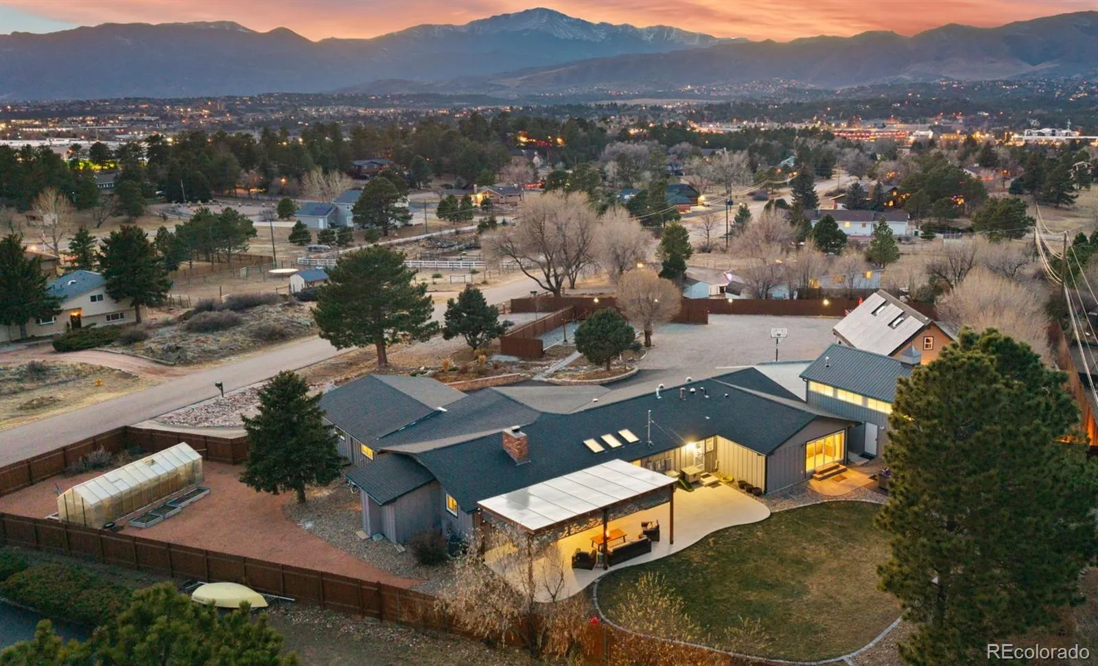 The serene backyard features a sprawling patio with custom pergola, lush lawn and mature pine trees that provide privacy and a peaceful Colorado setting. Gardeners will appreciate the greenhouse and raised garden beds, while summer evenings are best spent gathered around the fire pit, soaking in sweeping Pikes Peak views.