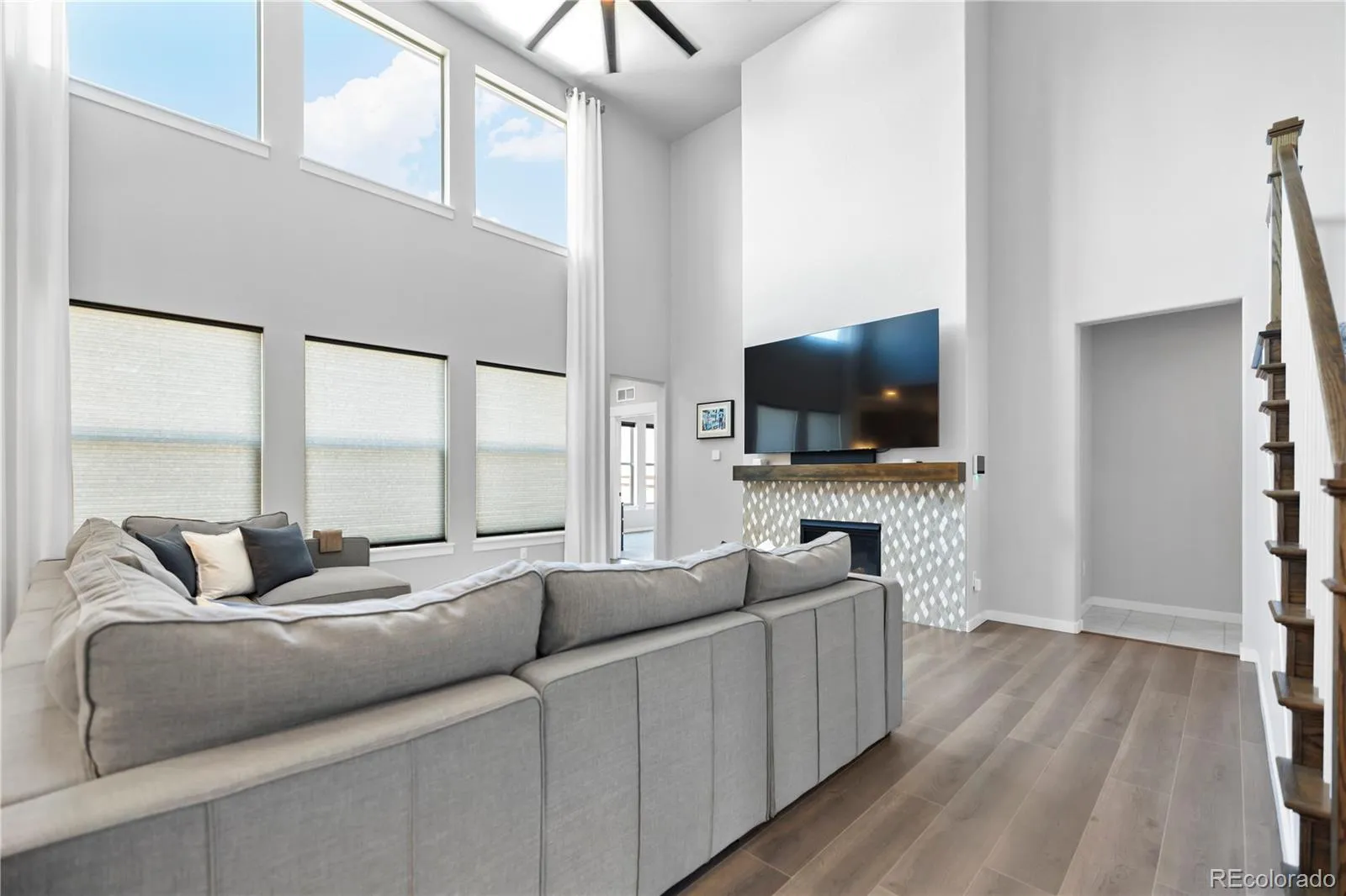 This 4-bedroom, 3-bath residence features an open floor plan with soaring ceilings, LVP flooring, and a cozy gas fireplace accented with designer tile. The chef’s kitchen is a true highlight, showcasing quartz countertops, stainless steel appliances, white cabinetry, and a walk-in pantry.