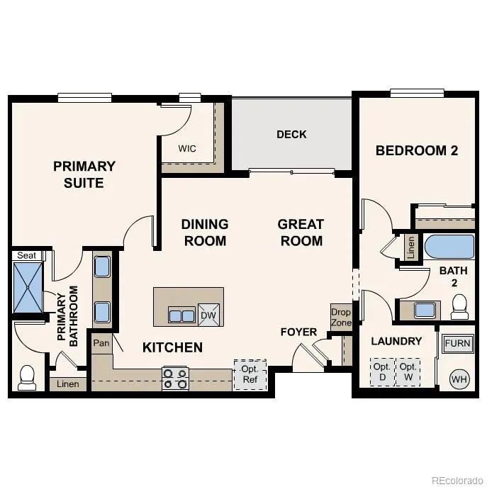 Welcome to Residence 2A at Grand Vue, featuring a stylish and functional open-concept layout. A wide-open great room—providing direct access to a covered deck—overlooks a charming dining area and a spacious kitchen with a center island and ample storage space. Additional highlights include a drop zone off the foyer, a convenient laundry room, a generous secondary bedroom and a full hall bath. And completing the home, a secluded primary suite boasts a sizable walk-in closet and a lavish private bathroom with dual vanities and a benched shower.