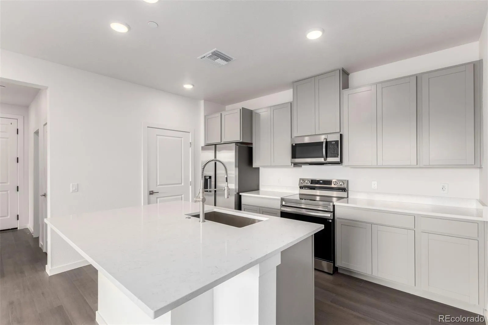 and our sleek and modern Colorado Complete finishes! The kitchen showcases quartz countertops and soft-close gray
