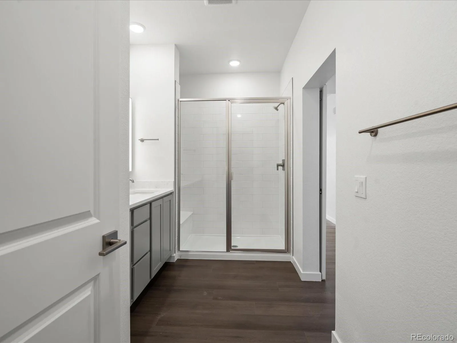 nickel hardware and fixtures add to the contemporary feel. Oversized subway tile in both baths and dual lighted mirrors in