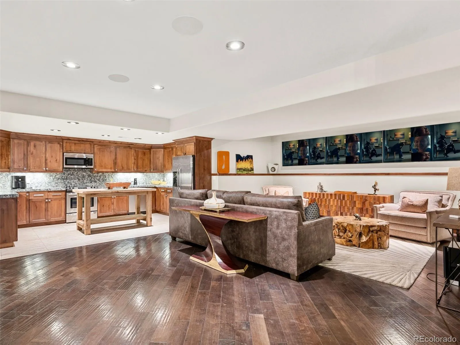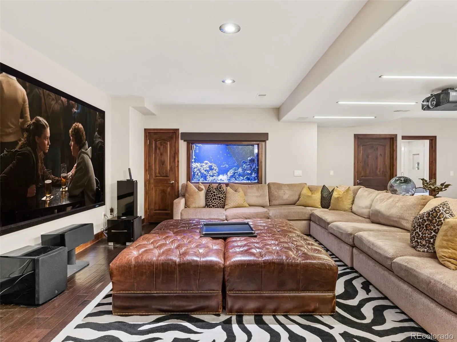 The lower level is an entertainer’s dream, offering a wraparound bar with beer taps and ambient lighting, a private home theater, a lounge divided by a built-in aquarium, plus a game room, additional kitchen, and multiple living areas for hosting at scale.