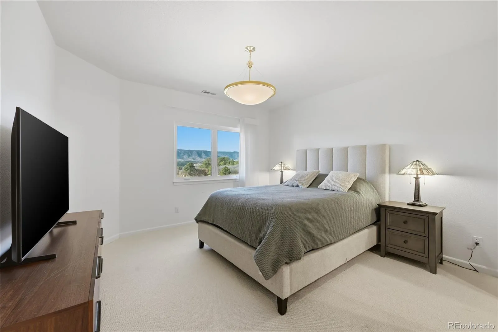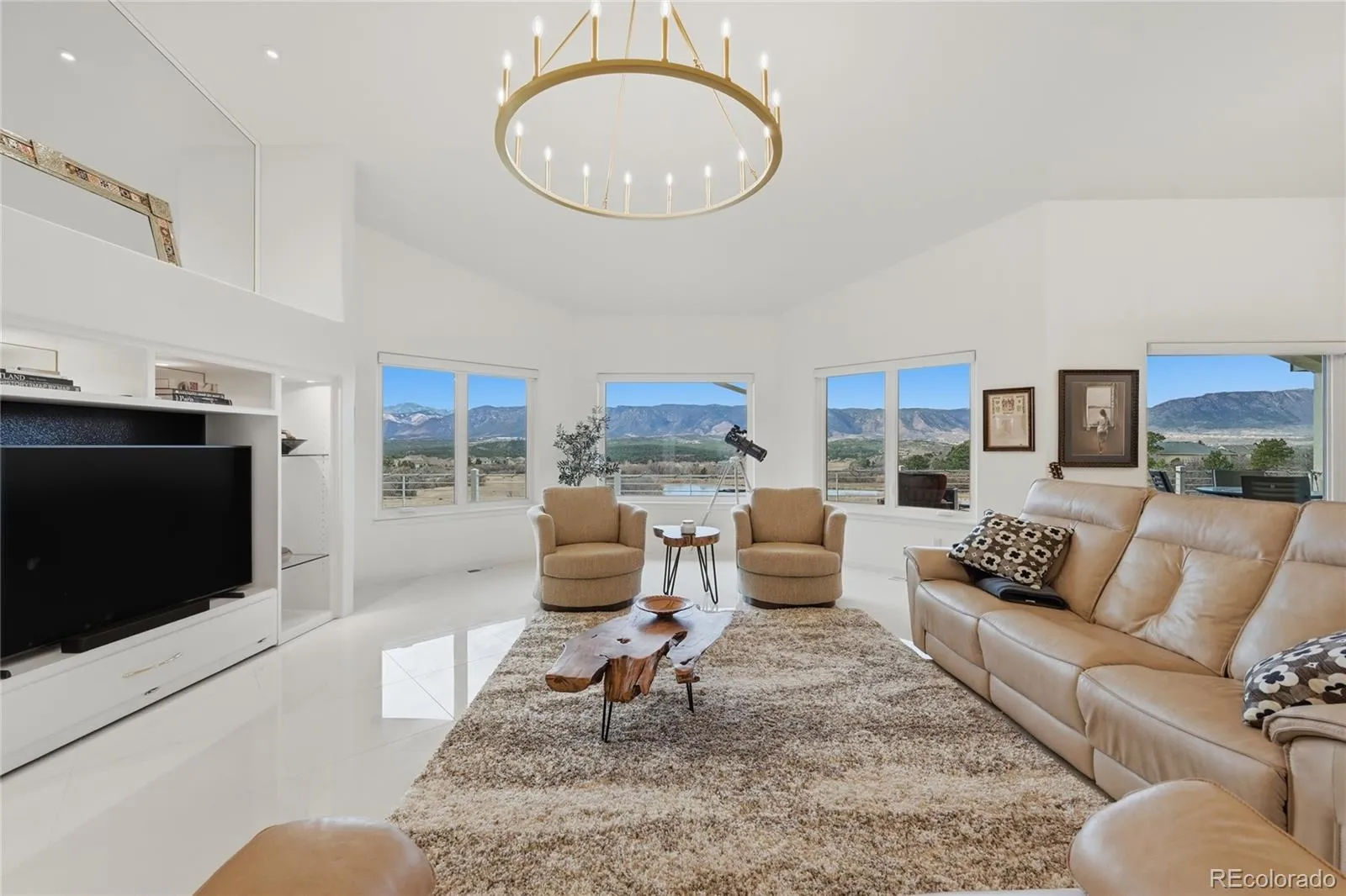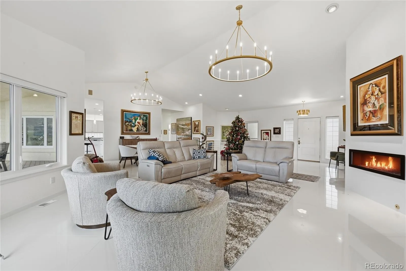 Immaculate Rancher with SPECTACULAR VIEWS & Premier Finishes. Welcome to this impeccably maintained, custom ranch style home, perfectly situated on a premium lot backing to open space, a serene pond & unobstructed Western mountain views. Designed for luxurious comfort & seamless indoor-outdoor living, this home offers breathtaking vistas from nearly every room—both on the main floor and finished walk-out lower level. The dramatic, vaulted great room boasts spacious living & dining areas, each with gorgeous lighting. The room features a custom fireplace with mirrored built-ins. It opens to a large, covered deck – perfect for entertaining with amazing panoramic views. Spacious, sun-filled kitchen w/granite counters, extensive cabinetry & a Cambria quartz island w/ induction cooktop. The luxurious private primary suite offers deck access and a nearby flex space ideal for a home office. The newly remodeled spa-style bath is truly a retreat, showcasing dual vanities (one with a built-in TV mirror), Cambria quartz accent walls, a freestanding soaking tub, oversized shower, dual water closets & two generous walk-in closets. A curved staircase leads to the expansive lower-level rec room, complete with a custom wet bar, beverage frig & beautiful granite buffet – perfect for hosting guests. Sliding glass doors open to a covered patio with more stunning mountain views. Two secondary bedrooms & a large full bath are located on this level, along with a dedicated storage room housing high-efficiency HVAC systems & extensive built-in shelving. The oversized 3-car garage is immaculate, featuring epoxy flooring, built-in cabinetry & bright LED lighting. Professional landscaping surrounds the property offering a lush, manicured lawn & eye-catching curb appeal and split-rail fencing in back yard. A refreshing take on mountain living, this contemporary Colorado home is thoughtfully upgraded with luxurious finishes and modern design.