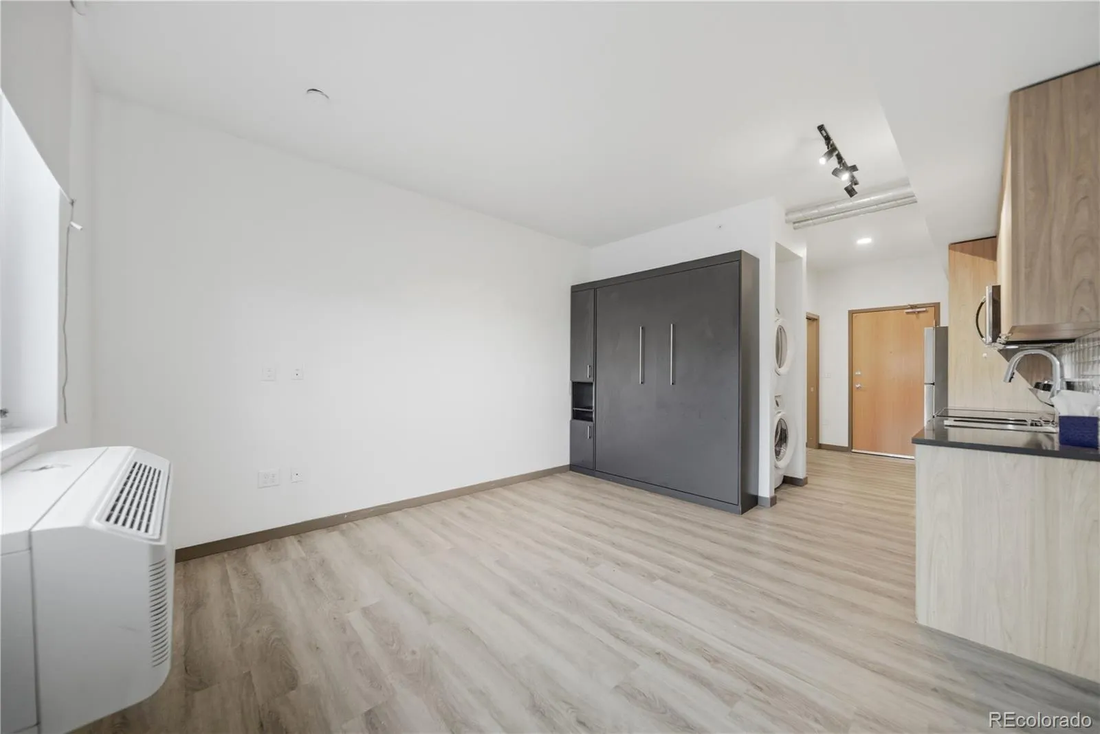 Modern studio condo in the heart of Denver’s Santa Fe Art District, just steps to galleries, restaurants, coffee shops, transit, and downtown. This efficient space features stainless steel appliances, LED lighting, a custom Murphy bed with mattress, full-size washer and dryer, generous storage, and a spacious bathroom with walk-in shower. Elevator building with bike amenities and low annual HOA dues that include water, sewer, trash, snow removal, insurance, and exterior maintenance. Walk Score of 90 offers true urban convenience and a lock-and-leave lifestyle in one of Denver’s most vibrant neighborhoods.
