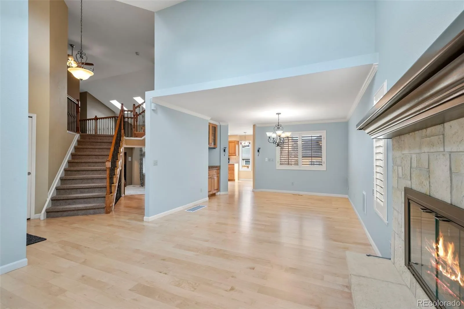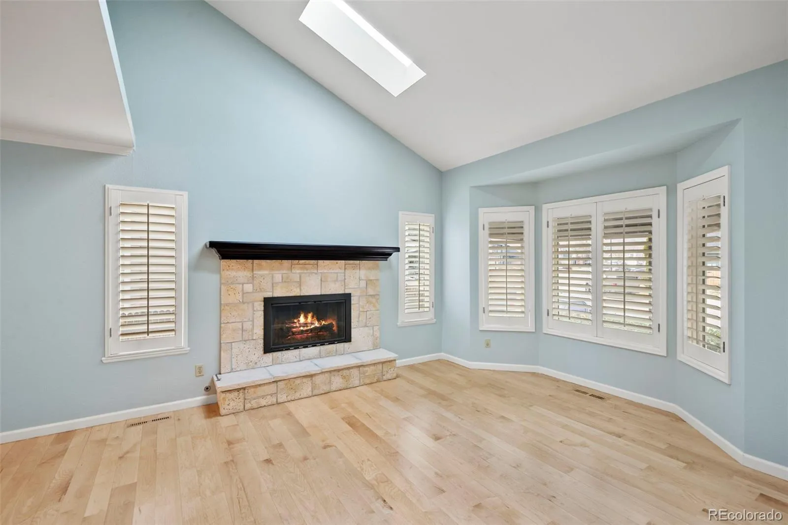 Step inside to discover a bright and inviting main level featuring maple hardwood floors, designer (new) paint accents, and abundant natural light. A cozy gas-fired fireplace anchors the living room, while skylights and bay windows enhance the warm, open atmosphere.