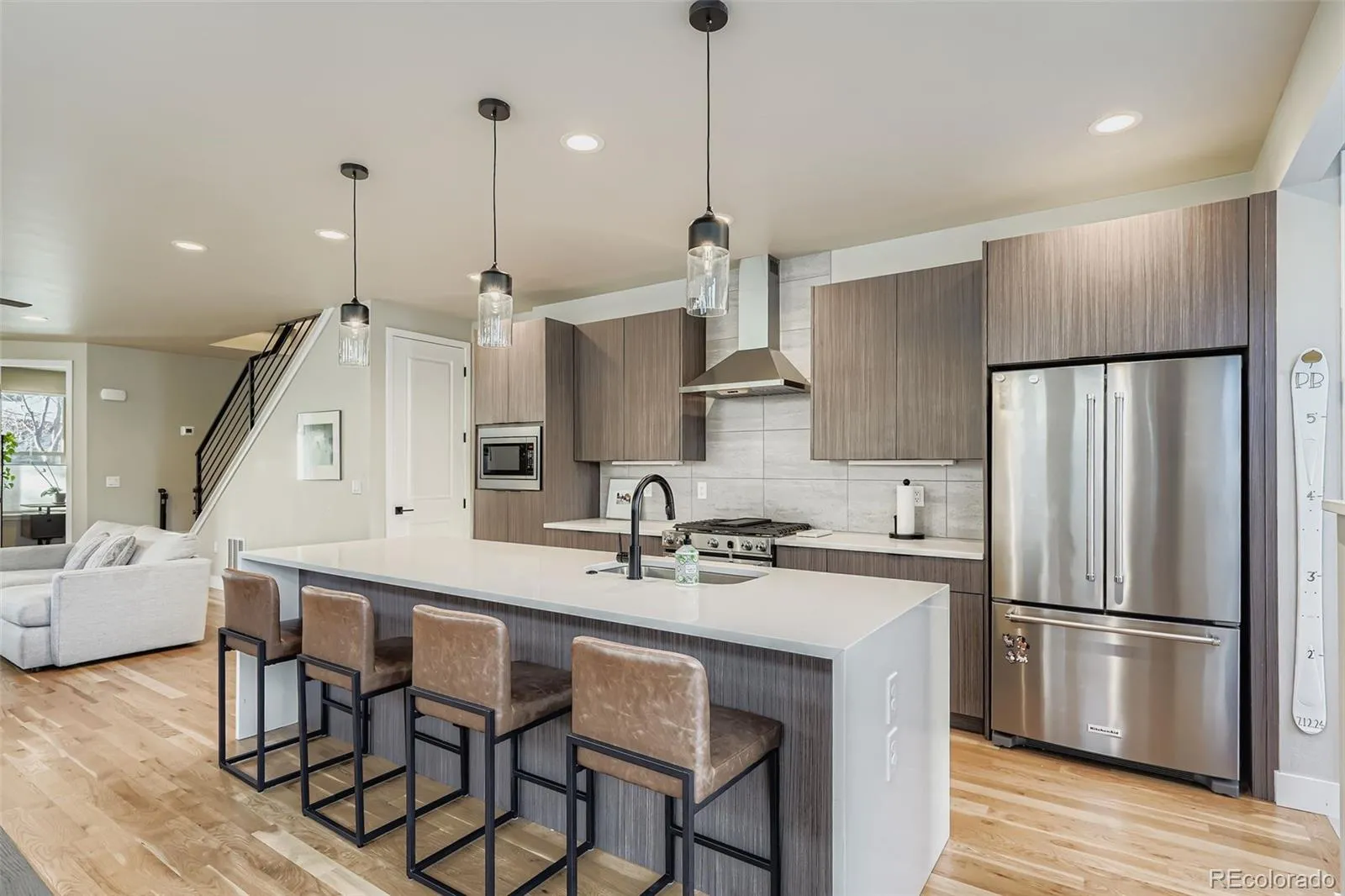 Modern Luxury Duplex 3 Bed / 4 Bath + Office + 3rd Level Loft + South facing Rooftop Deck… in Denver’s beloved Sunnyside Neighborhood. This is the coveted South End Unit drenched w/sunny natural light and the perfect combination of modern luxury + neighborhood charm. Quiet Street, Open-concept main level, REAL Oak hardwood floors, large windows, + high ceilings. The chef’s kitchen is a dream w/ stainless steel appliances, waterfall quartz countertops, a center island, + the dining area opens up to the backyard through a bifold glass wall that brings the outdoors in year-round. The living area features a gorgeous fireplace w/a ceiling-high ceramic tile hearth, adding warmth + sophistication to the space. At the front of the house, is a dedicated office space, perfect for remote work, study, or creative pursuits. Retreat to the spacious master suite featuring a walk-in closet + a luxurious en-suite bathroom with dual vanities and a walk-in wet room with a shower and soaking tubs. Exquisite design choices for finishes/tile, you will feel the difference in Quality. Two more bedrooms offer plenty of space for family members or guests, each with easy access to a shared bathroom. The Laundry Room is conveniently located on this level. The top floor also offers a flexible space that can serve as a family room, entertainment area, or even a 4th bedroom with a 4th Bathroom! Sliding glass doors lead to an upper-level deck where you can enjoy the seasons with a magnificent mature tree and gas/water hookups. The two-car garage keeps your vehicles clean + secure while the additional loft provides extra storage space for your tools and toys. High Efficiency HVAC, Central A/C, Tankless Hot water heater, + dedicated heat/cool mini-split for the 3rd level loft. Don’t miss the opportunity to make this stunning duplex your new home in one of Denver’s most desirable neighborhoods. You will feel the difference in quality.