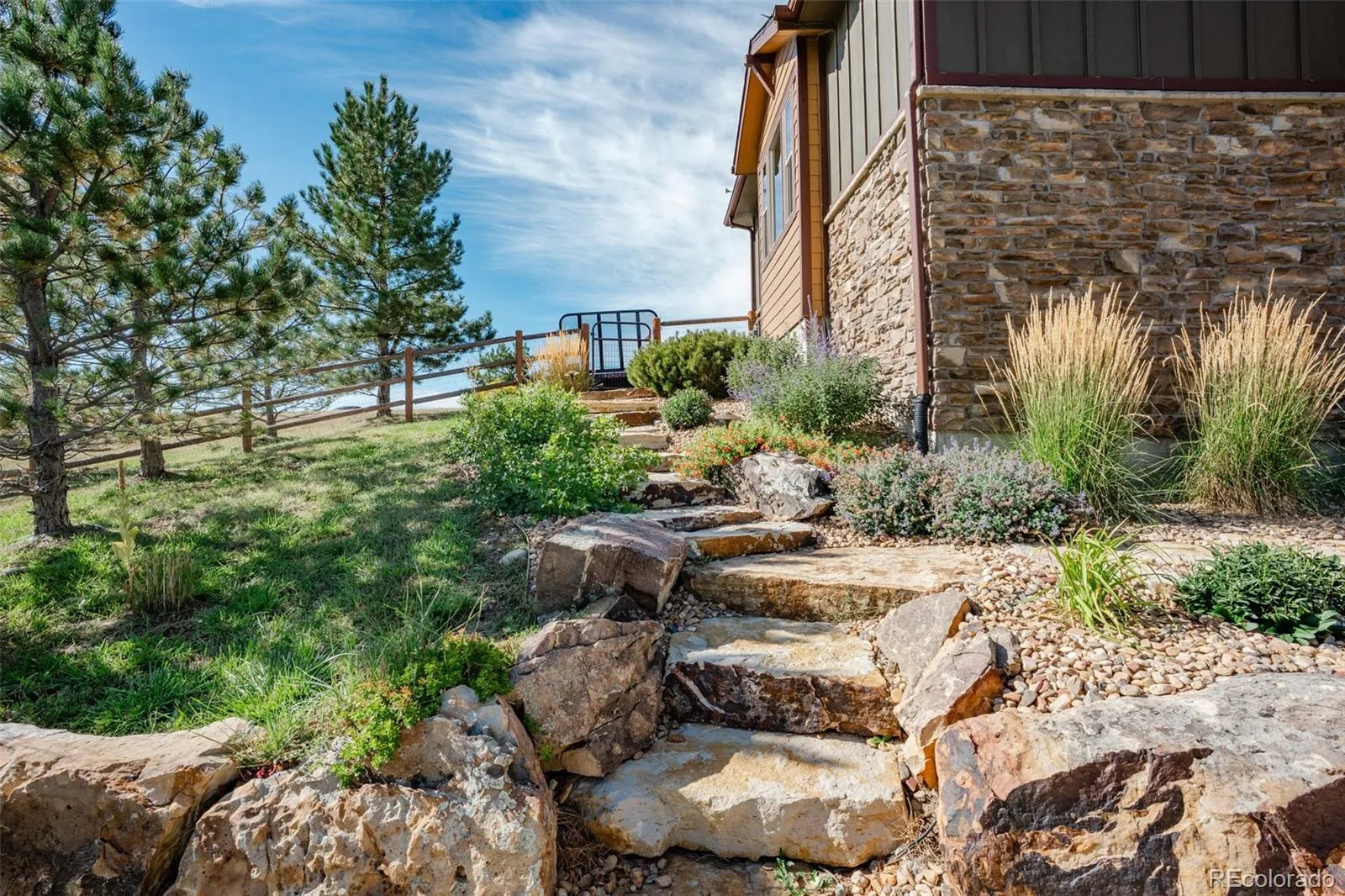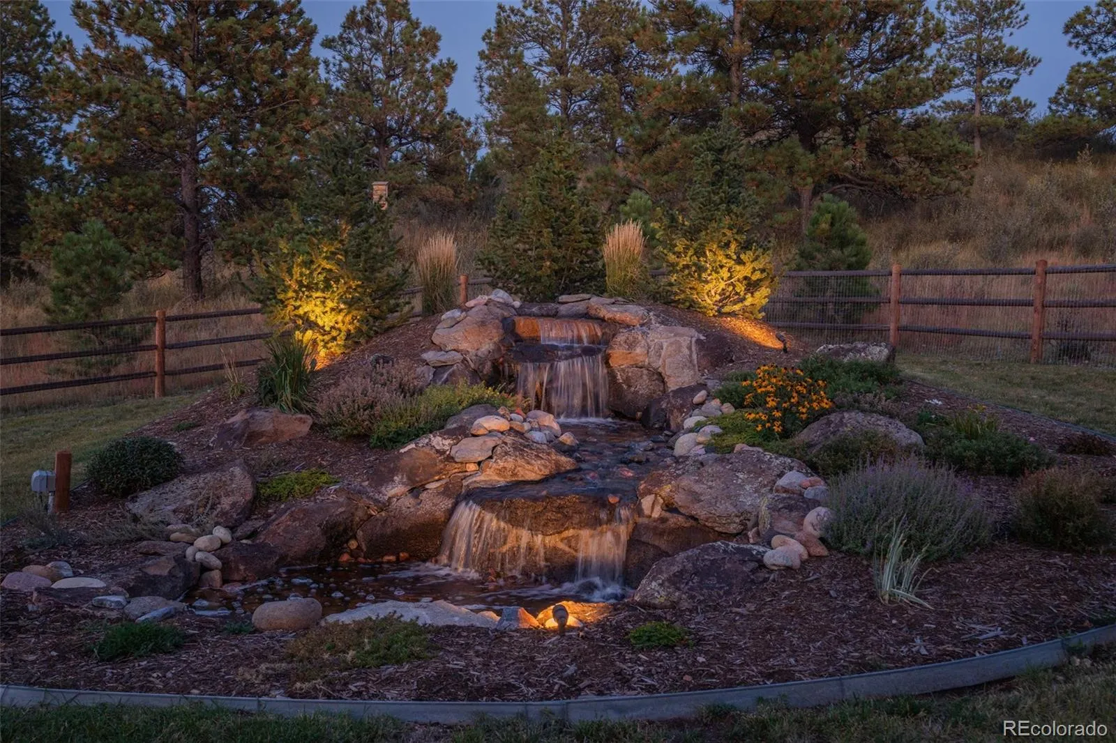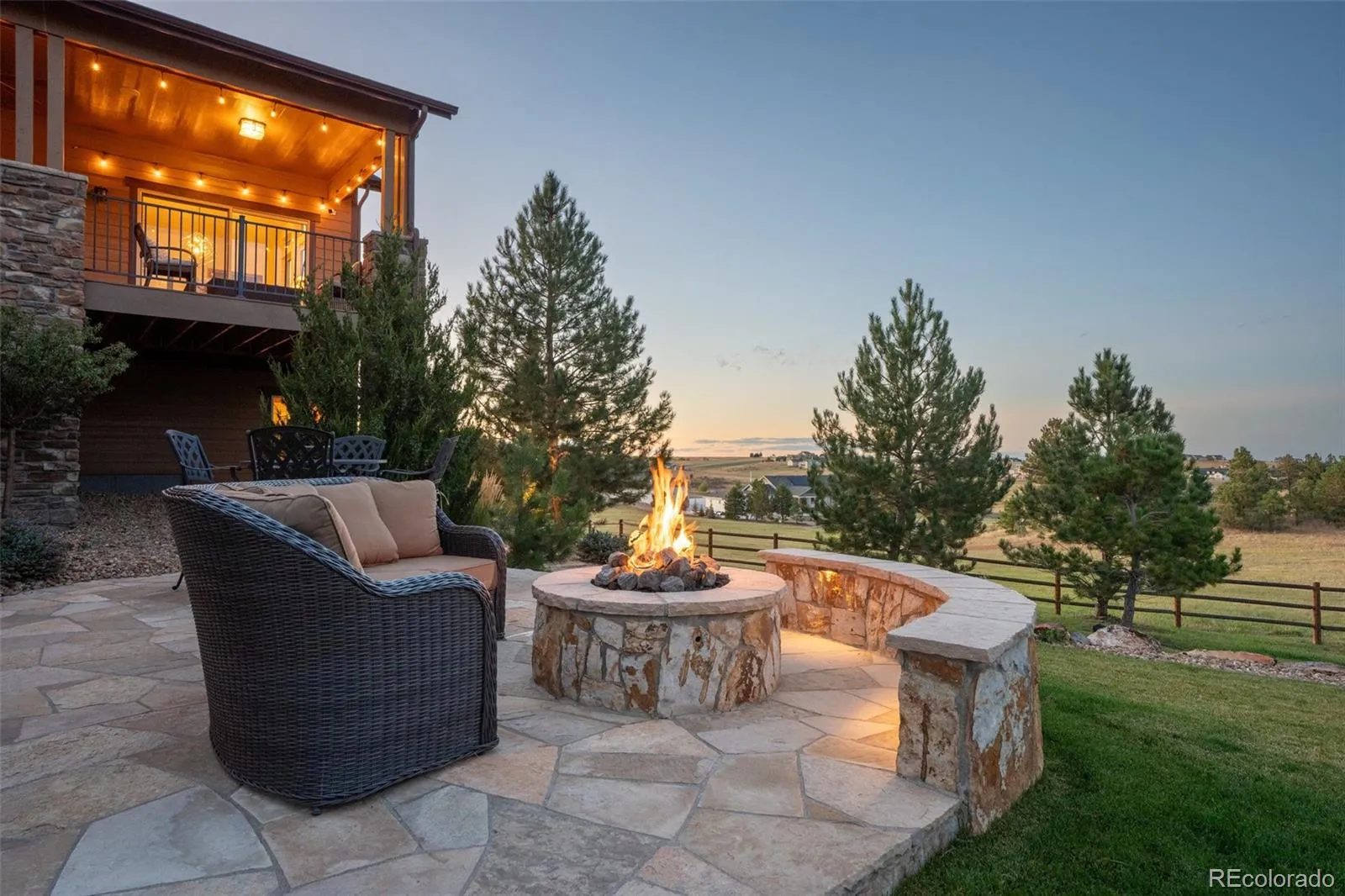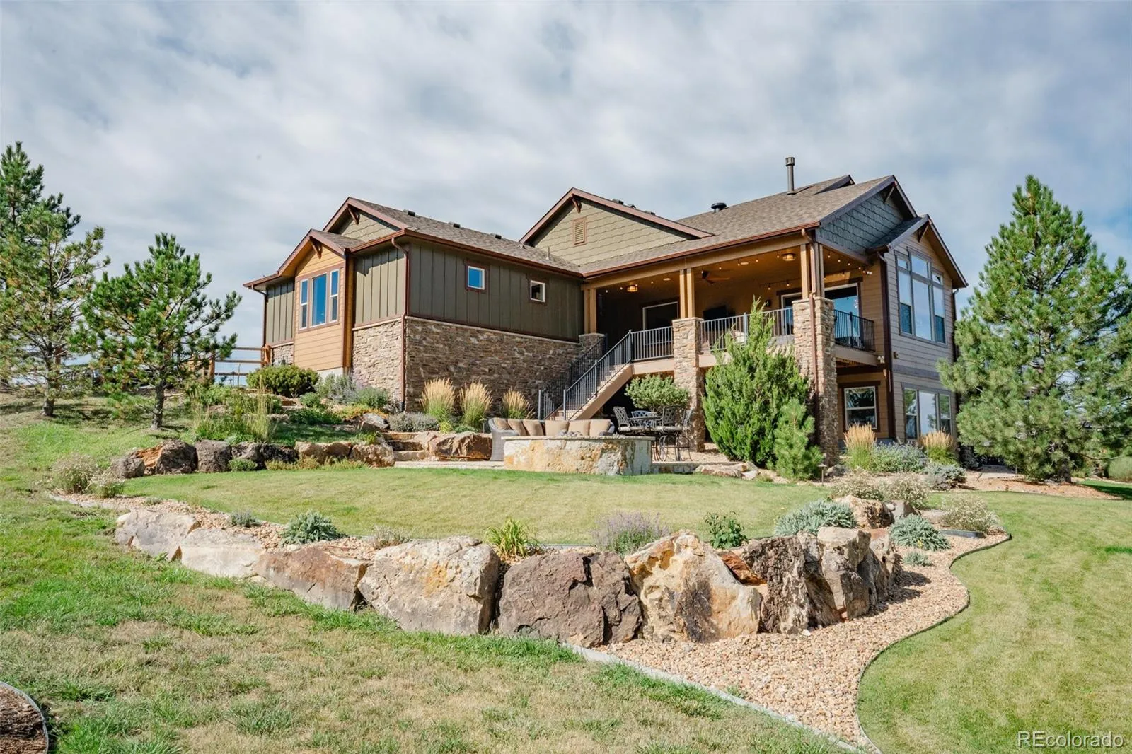 Experience refined Colorado living in this horse-friendly residence in the sought-after Wild Pointe neighborhood. Set on one of the community’s premier 5-acre lots, this estate offers 4 beds, 6 baths, ~5,743 finished sqft, all surrounded by meadow views, common open space, new fencing, and sweeping Front Range views. Outdoors, the updated backyard features a flagstone patio w/fire pit, tranquil waterfall, flagstone walkways, & front and back landscaping. Inside, thoughtful finishes include white oak hardwoods, knotty alder doors/trim, leathered granite, custom built-ins, & upgraded lighting. The great room is highlighted by vaulted ceilings & floor-to-ceiling windows, anchored by a full stone fireplace w/handcrafted wood mantel & built-ins. The adjoining family room offers expansive windows, statement chandelier, a double-sided full stone fireplace, with sliding doors opening to a covered composite deck overlooking the waterfall and access to an additional balcony w/open space views. The gourmet kitchen balances style and function w/white oak hardwood floors, custom cherry cabinetry, & an apron sink positioned beneath a picture window capturing peaceful waterfall views. The main-level primary suite offers large windows w/serene views and a spa-inspired five-piece bath featuring a soaking tub, dual vanities, oversized multi-head shower, and two walk-in closets with built-ins. A dedicated main-level office may also serve as a fifth bedroom and includes a Murphy bed with nearby 3/4 bath. The true walk-out lower level includes a spacious family room with wood flooring and carpet inlay, stone and beam accents, a wet bar with cherry cabinetry, and access to the covered patio. A guest suite with en-suite bath and patio access, two additional bedrooms and a 3/4 bath added by the seller, a powder room, and a fireproof safe room complete the level. Offering privacy, horse potential, and quality craftsmanship, this Wild Pointe property delivers Colorado living w/space to roam.