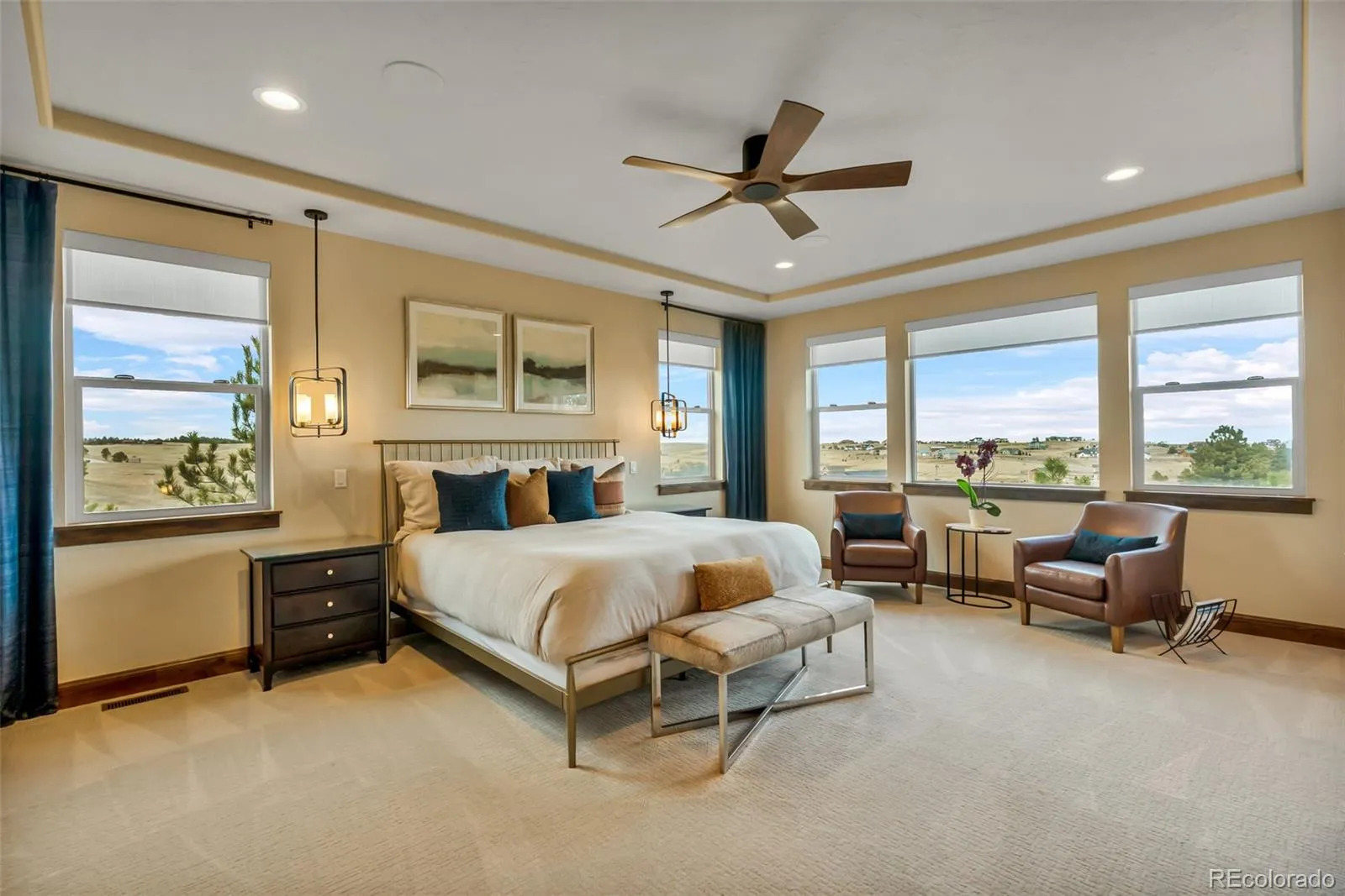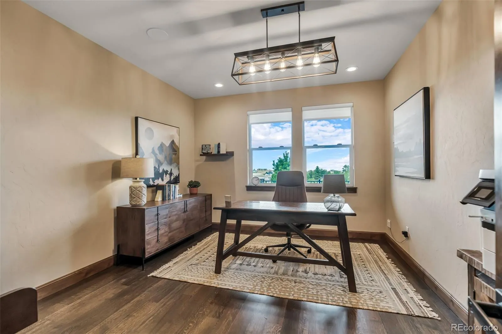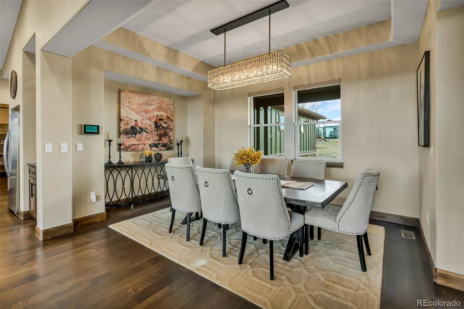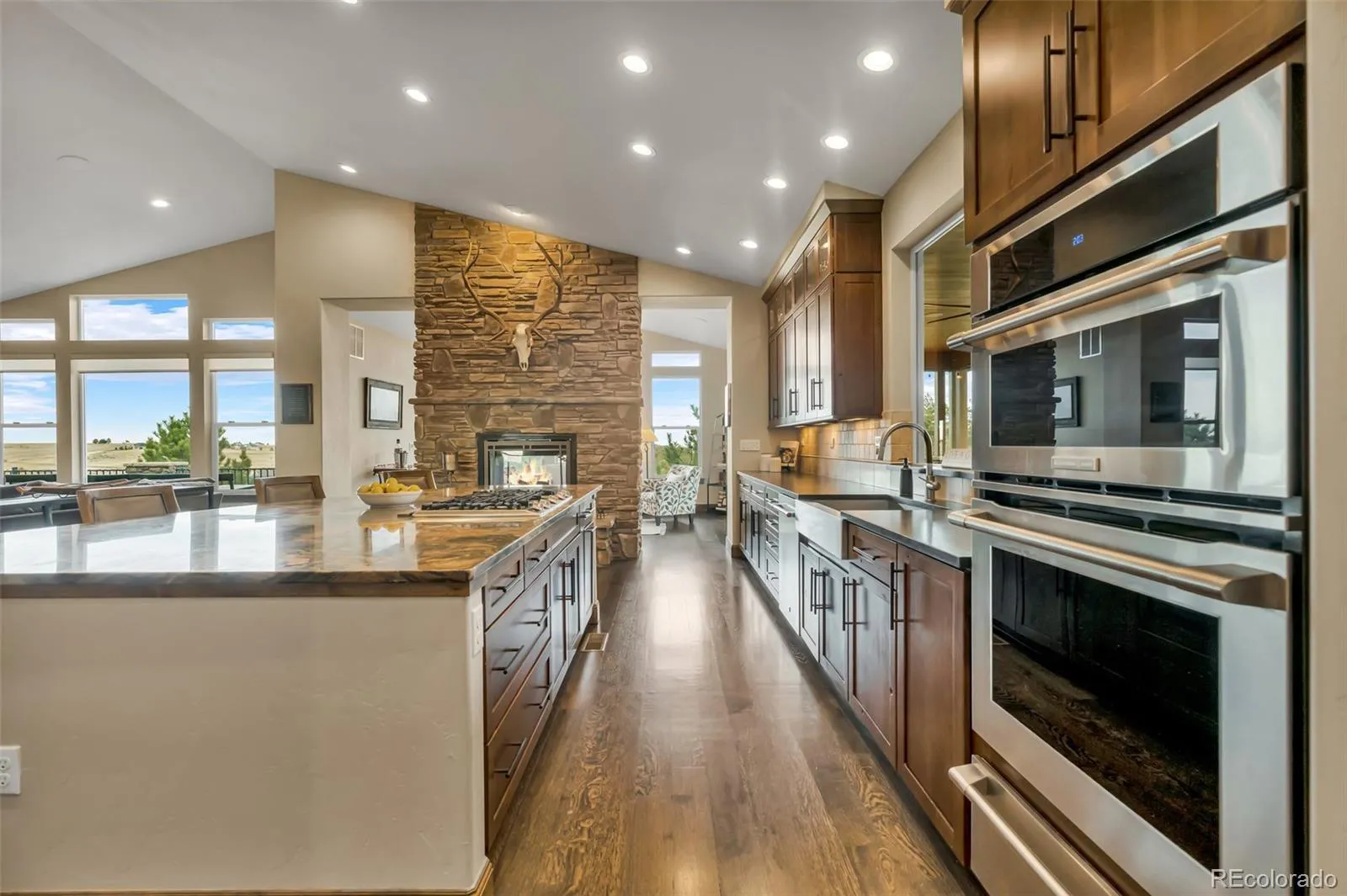 Experience refined Colorado living in this horse-friendly residence in the sought-after Wild Pointe neighborhood. Set on one of the community’s premier 5-acre lots, this estate offers 4 beds, 6 baths, ~5,743 finished sqft, all surrounded by meadow views, common open space, new fencing, and sweeping Front Range views. Outdoors, the updated backyard features a flagstone patio w/fire pit, tranquil waterfall, flagstone walkways, & front and back landscaping. Inside, thoughtful finishes include white oak hardwoods, knotty alder doors/trim, leathered granite, custom built-ins, & upgraded lighting. The great room is highlighted by vaulted ceilings & floor-to-ceiling windows, anchored by a full stone fireplace w/handcrafted wood mantel & built-ins. The adjoining family room offers expansive windows, statement chandelier, a double-sided full stone fireplace, with sliding doors opening to a covered composite deck overlooking the waterfall and access to an additional balcony w/open space views. The gourmet kitchen balances style and function w/white oak hardwood floors, custom cherry cabinetry, & an apron sink positioned beneath a picture window capturing peaceful waterfall views. The main-level primary suite offers large windows w/serene views and a spa-inspired five-piece bath featuring a soaking tub, dual vanities, oversized multi-head shower, and two walk-in closets with built-ins. A dedicated main-level office may also serve as a fifth bedroom and includes a Murphy bed with nearby 3/4 bath. The true walk-out lower level includes a spacious family room with wood flooring and carpet inlay, stone and beam accents, a wet bar with cherry cabinetry, and access to the covered patio. A guest suite with en-suite bath and patio access, two additional bedrooms and a 3/4 bath added by the seller, a powder room, and a fireproof safe room complete the level. Offering privacy, horse potential, and quality craftsmanship, this Wild Pointe property delivers Colorado living w/space to roam.