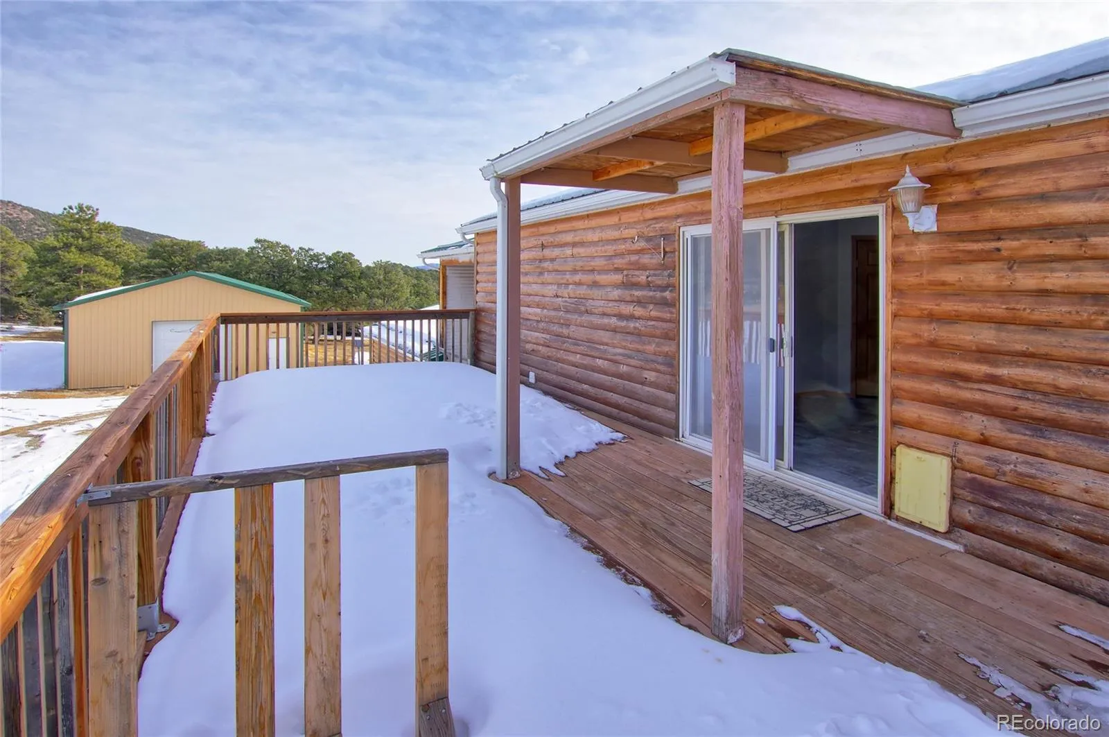 You have found your private oasis, a 5/3/2 log sided home nested in the trees on 5+ acres as a brick walkway leads you to a 13 x 9 wood deck entering into the ceramic tiled foyer. Living room wood burning custom built fireplace comes with a remote to control the temperature on cozy, winter evenings. Kitchen offers, island, gas cooking, huge pantry, counter bar, cabinets galore, desk area, and walks out to wood deck with heated ramp. Basement entry is custom barn doors and the very spacious family room has a pellet stove, dry bar, and lots of storage. This home brings in a lot of natural light. All bedrooms are equipped with ceiling fans, as are the family and living rooms. Lvt floors are in all baths, kitchen, dining room, and laundry room. The bedrooms, living and family rooms are carpeted. Scenic landscape and beautiful mountain views with secluded acreage draws you here to this property…but it is the huge shop described below plus the other improvements listed too that make you want to stay… ~30′ x 56′ x 12′ eave metal shop (6 yrs): concrete floor, 2″ blown in insulation on walls and 3″ blown in insulation on ceiling, front and back 10′ x 12′ bay doors with electric opener on front and 3 remotes, front and back entrance doors, completely wired with receptacles and LED lights, wired for welding machine by front and back bay doors, piping and fittings for air compressor. ~Replaced OSB siding and log ends (7 yrs), Water filter & softener (6 yrs), ~RV 30 amp power box (5 yrs), widened & insulated garage doors, bladder/pressure tank, 50 gal water heater, swamp cooler, refrigerator, barn doors, stone/brick fireplace (4 yrs), front and back decks (3 yrs), kitchen updated, propane stove, main flooring (2 yrs), basement bedroom closets (1 yr), exterior stain (10/24) all interior wall & ceiling paint (12/24).