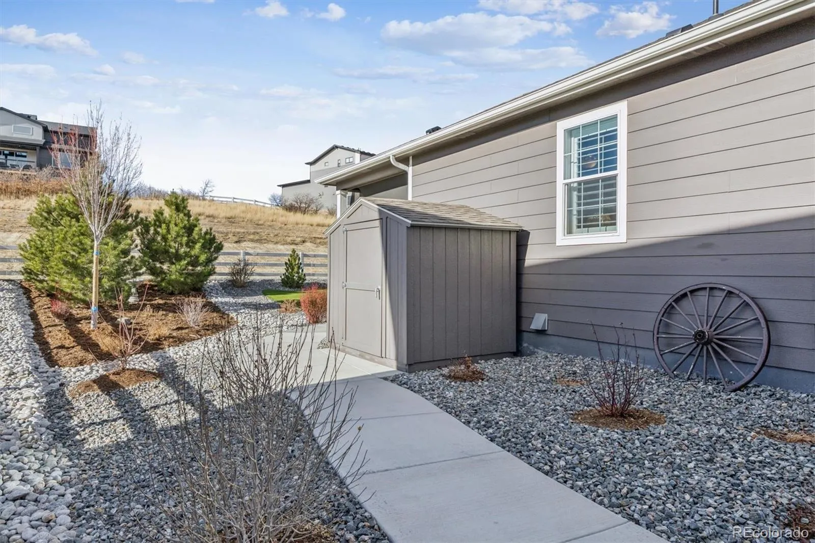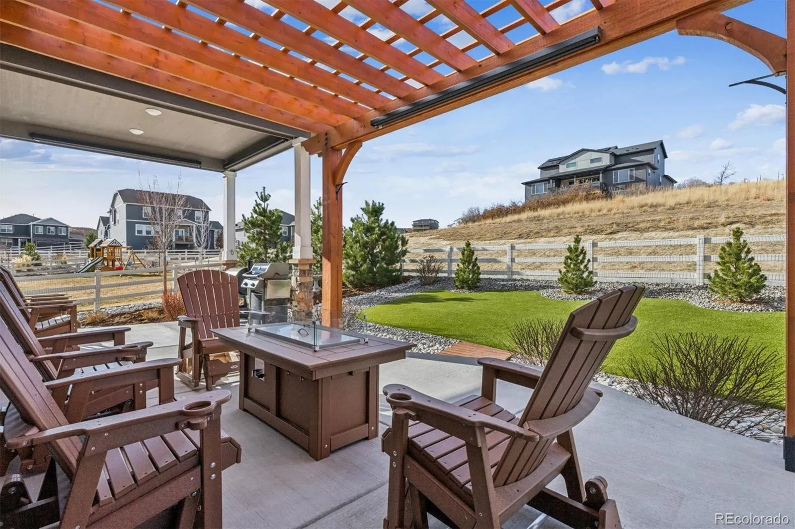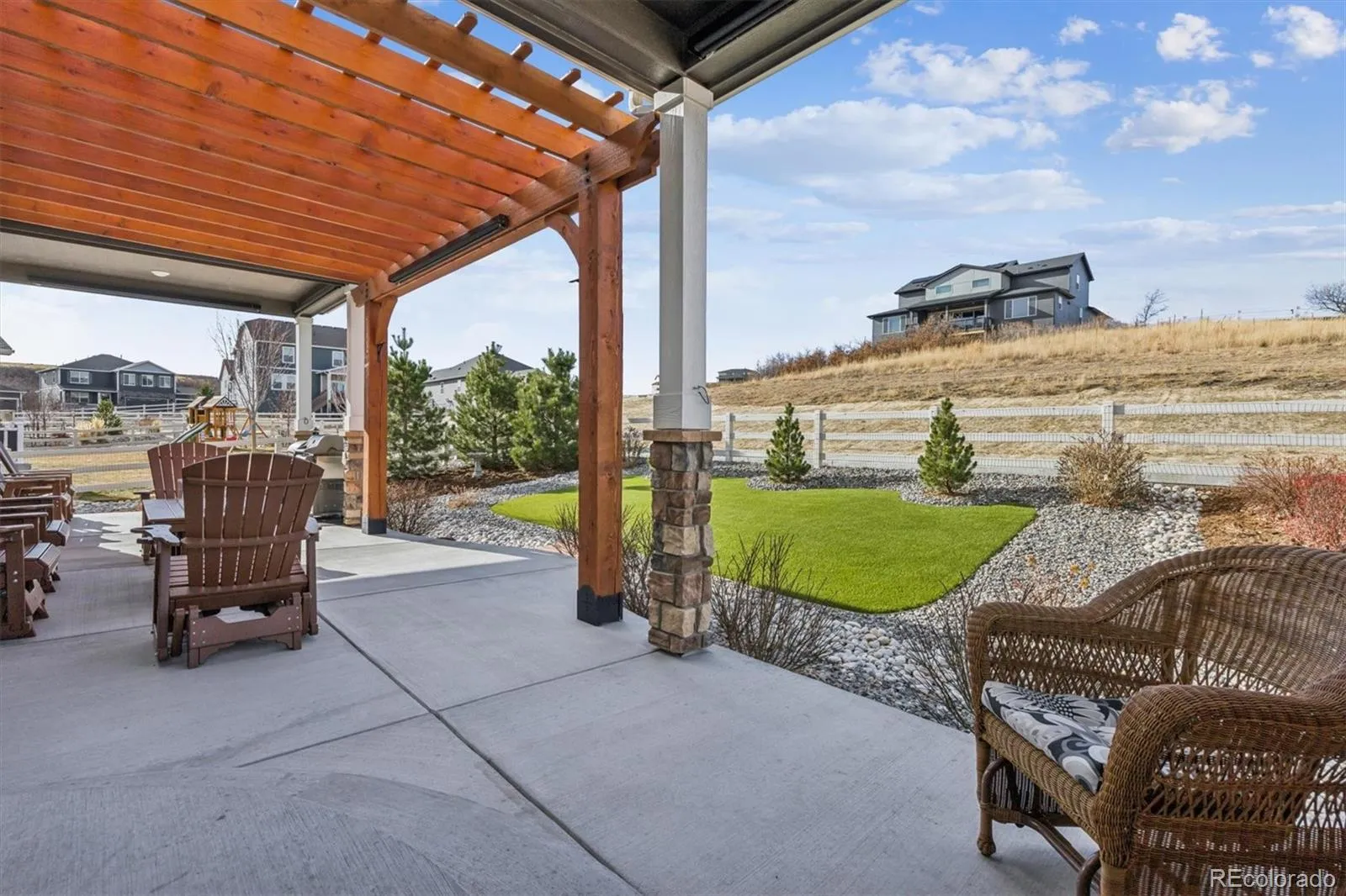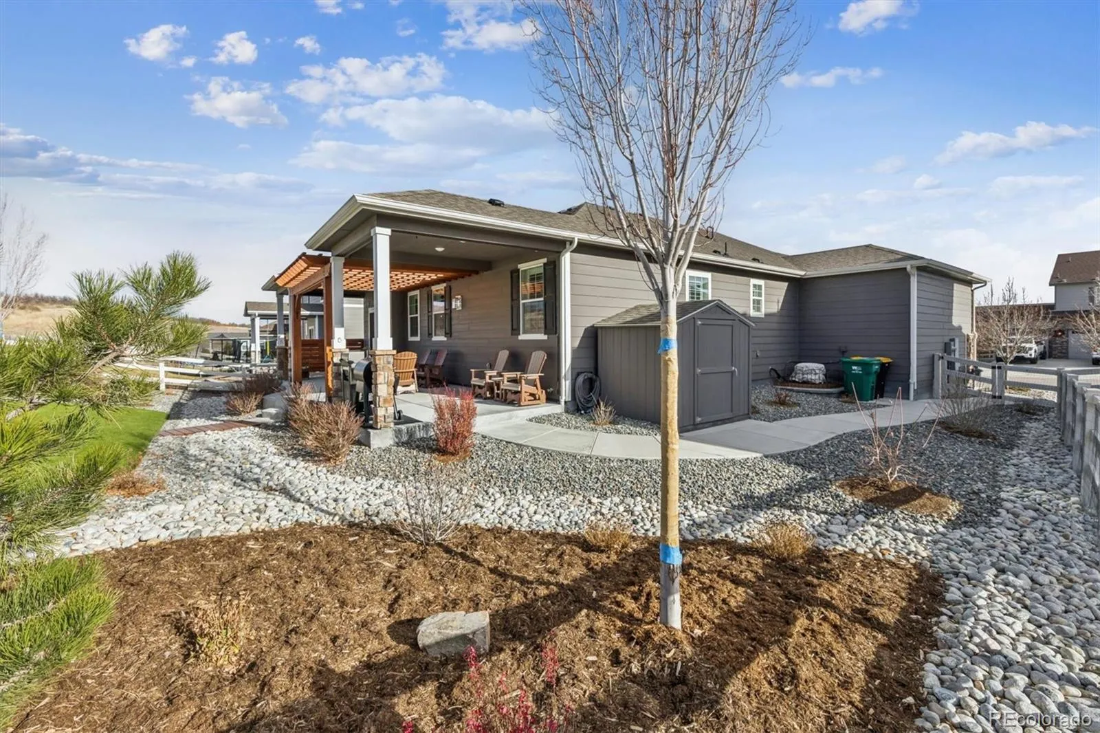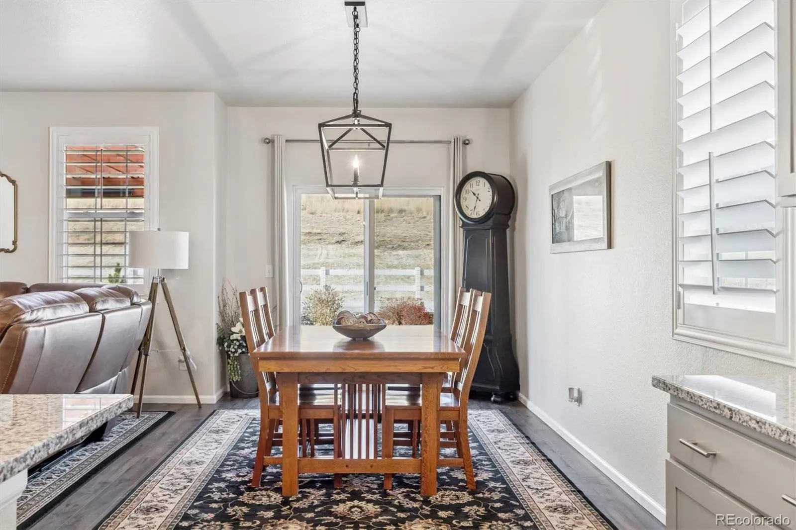 Welcome home to contemporary living in this heavily upgraded ranch-style home backing to open space, this is 6015 Plains End Court. Grand 9’ ceilings, stunning engineered hardwood floors, abundant natural light, and curated finishes greet you upon entry and unfold to a spacious open floorplan, ideal for everyday living and entertaining. The gas fireplace with a tile surround and a reclaimed-wood mantel serves as the focal point in the inviting great room. Enjoy preparing a meal in the gourmet kitchen, complete with an oversized center island, granite counters, grey shaker cabinetry, a stainless steel appliance package, and a walk-in pantry. Step outside to your entertainer’s backyard- this exceptional backyard truly sets the home apart. Thoughtfully designed with extensive owner upgrades, it features a major structural addition creating a second covered patio with drop-down sun shades, a beautifully constructed pergola, professionally designed landscaping, and upgraded trees added for enhanced privacy — making this outdoor space a true highlight of the home. Retreat to your main-level primary suite. This idyllic sanctuary features a large walk-in closet with built-in cabinetry and an ensuite upgraded 4-piece bath with a walk-in shower. Two generously sized secondary bedrooms, a full bath, and laundry round out the main level. Additional features of this turn-key residence include plantation shutters throughout, an upgraded lighting package, a large completed crawlspace with high quality vapor barrier for all storage needs and a massive 3-car finished garage with even more storage. Crystal Valley Ranch is a family-friendly community in the heart of Castle Rock, only moments from Douglas County schools, parks, shopping, dining, and abundant outdoor activity. This home is ready for its next chapter; all it needs is you!