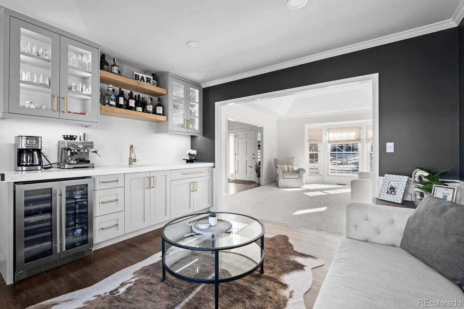 The newly remodeled kitchen is a showstopper, with quartz countertops, new cabinetry, and premium JennAir appliances—perfectly designed for both everyday living and entertaining. The wet-bar in the butlers pantry is an entertainer’s dream, featuring storage and a wine fridge. The family room is warm and inviting with custom built-in storage and a striking stone fireplace.