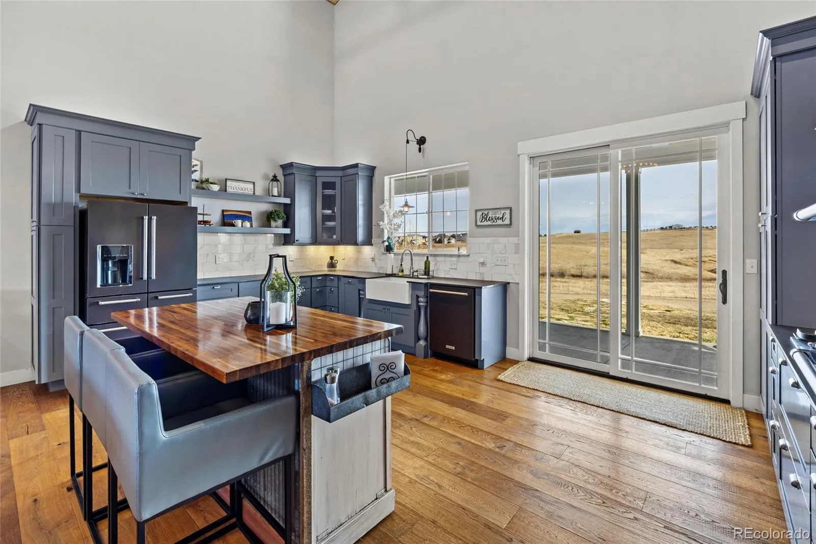 The chef’s kitchen is thoughtfully designed with stainless steel appliances, a gas cooktop with pot filler, double ovens, quartz countertops, custom cabinetry with pullouts, an automated mixer lift, and a movable island with a wood top—ideal for both everyday living and entertaining.