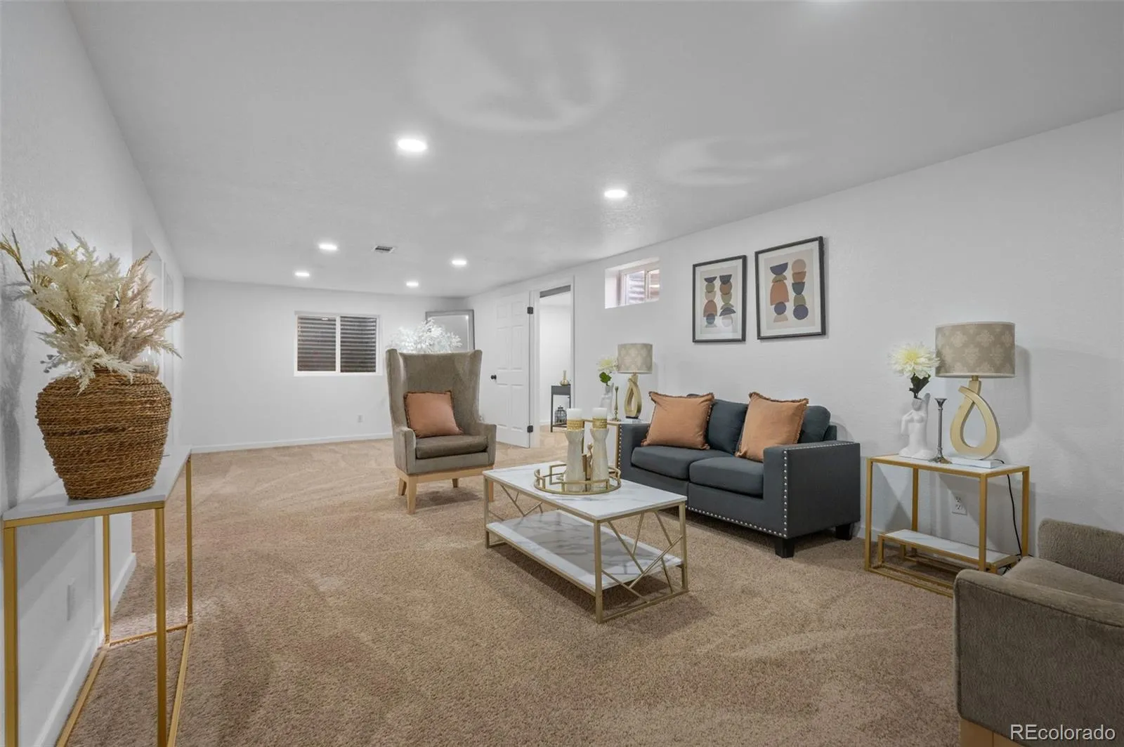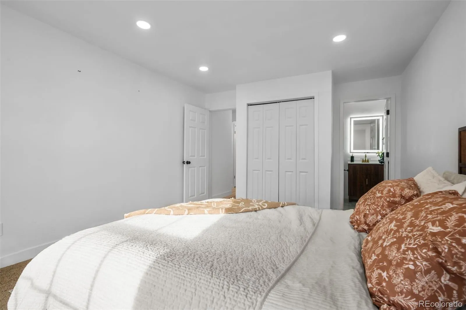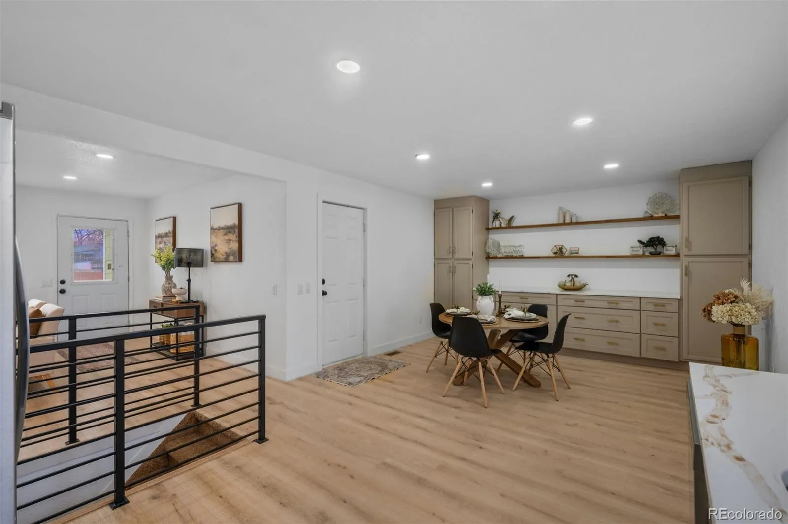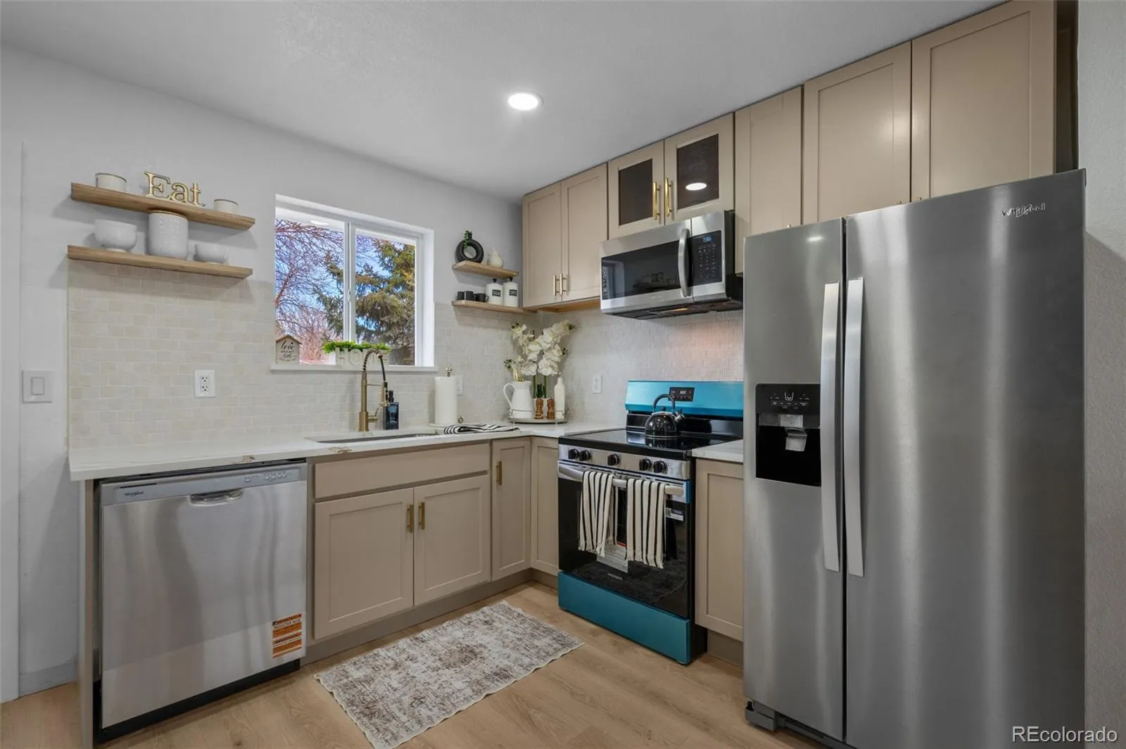 Welcome to this beautifully remodeled ranch-style residence, ideally situated in one of Arvada’s most desirable neighborhoods. Thoughtfully updated throughout, this home offers an open and inviting floor plan highlighted by a custom black metal railing and a sleek, newly installed electric fireplace that anchors the living space with modern elegance. The kitchen has been upgraded with brand-new stainless steel appliances, quartz countertops, and a stylish tiled backsplash—perfect for both everyday living and entertaining. The main-level primary suite provides comfort and privacy with its own beautifully finished en-suite bathroom.