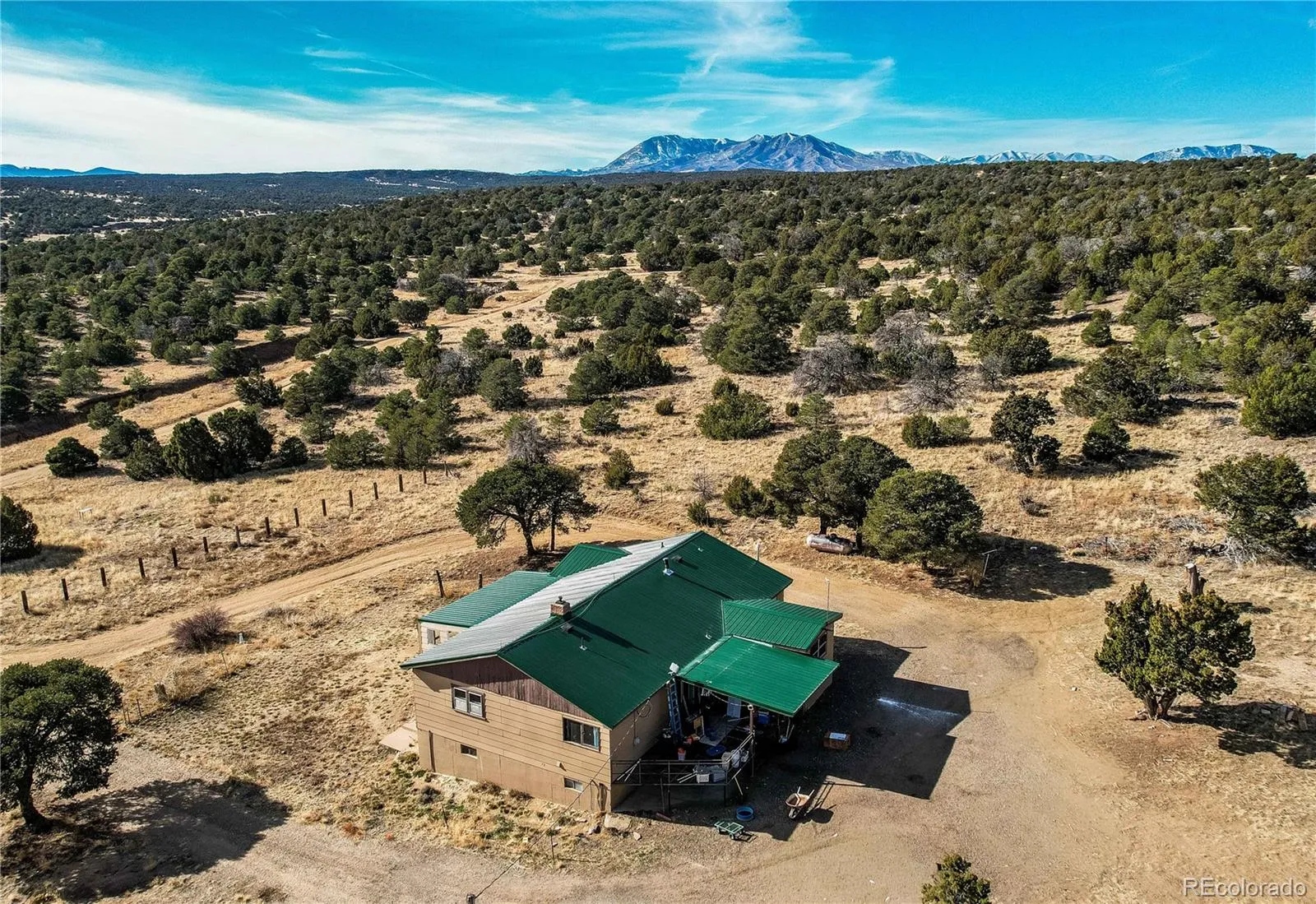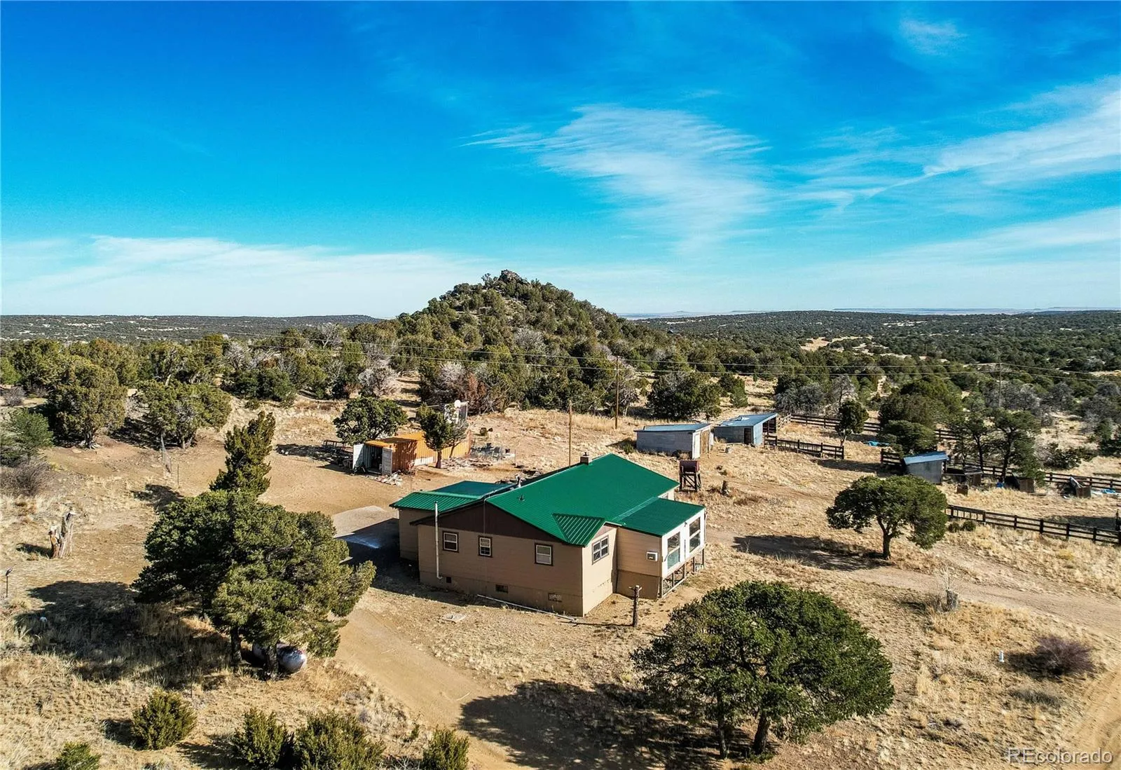 This incredibly beautiful and unique Colorado mountain ranch setting offers stunning views of the Spanish Peaks and Greenhorn Mountain, set in complete seclusion on approximately 83 acres. Designed as the ideal homesteading retreat, the property provides privacy, space, and the infrastructure needed for self-sufficient living. Enjoy expansive mountain views throughout the home, with walk-out access to a front deck and a rear porch perfect for taking in the peaceful surroundings. The property includes everything needed to operate a working homestead, including a well, septic system, electricity, an owned propane tank, outbuildings, and fencing. It has previously supported cattle, hogs, goats, chickens, and horses, making it well-suited for livestock or agricultural use. The home is sold as-is and priced accordingly, with the roof, water heater, furnace, and plumbing all in working condition and replaced in the last 5 years. Multiple heating sources ensure comfort year-round, including a pellet fireplace in the living room and a pellet stove in the basement for cozy winter days. A large covered southern porch has been converted into a warm and inviting family room, perfect for relaxing by the fire while enjoying snowy mountain views. The main level also features four bedrooms, a bathroom, and a laundry room. A large kitchen area is waiting for your finishing touches. Despite the privacy, the property is just 15 minutes from the quaint town of Walsenburg for shopping and supplies. Nearby recreation includes Lathrop State Park with two lakes for boating, fishing, and paddling, the Pike–San Isabel National Forest for hiking and camping, and Cuchara Mountain Park for skiing. La Veta, Pueblo, and Trinidad are all within an easy drive. This rare homesteading ranch at the perfect price to make it fit all your needs. Breathtaking scenery, privacy, and the freedom to live sustainably in the Colorado mountains.
