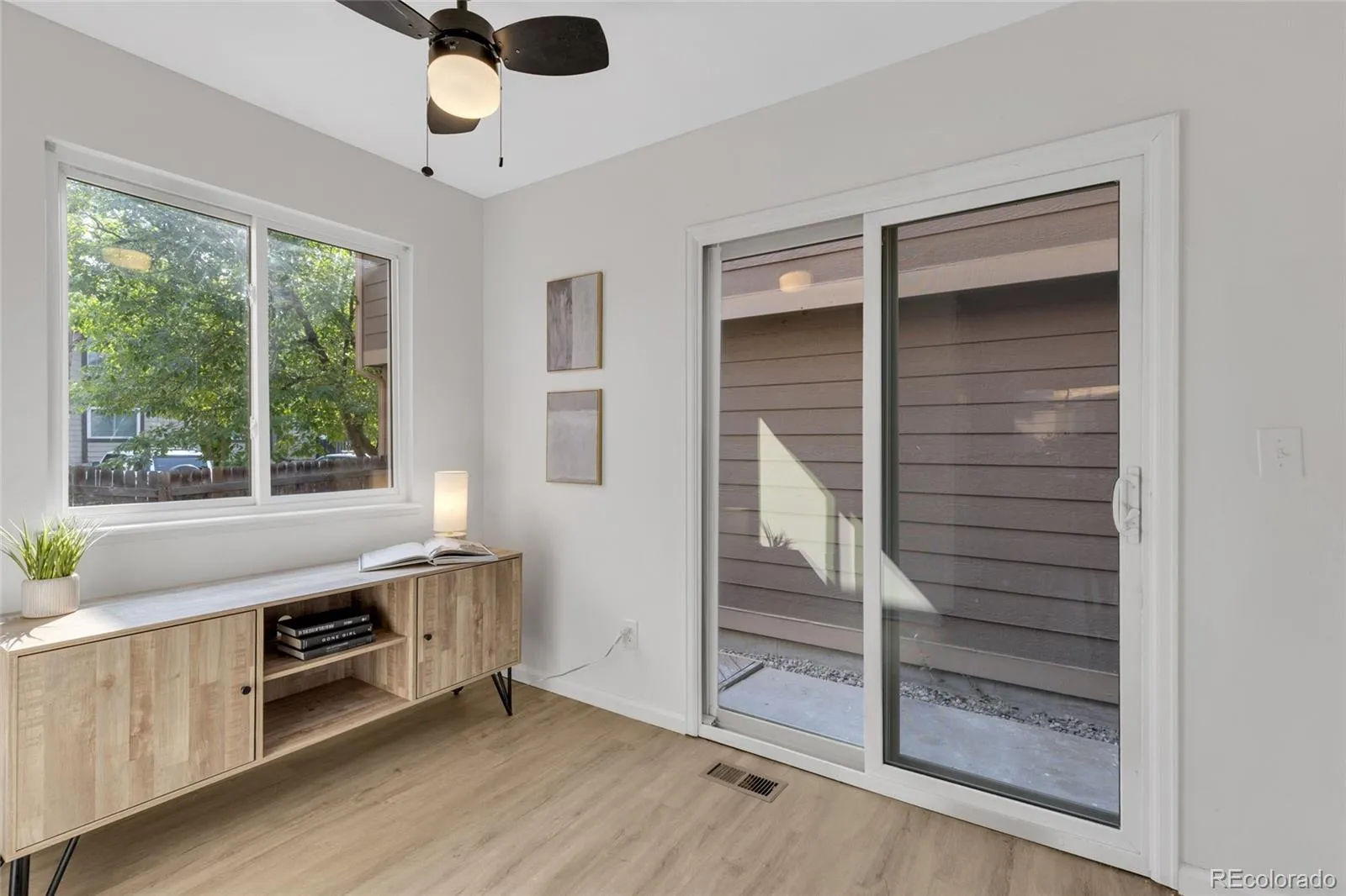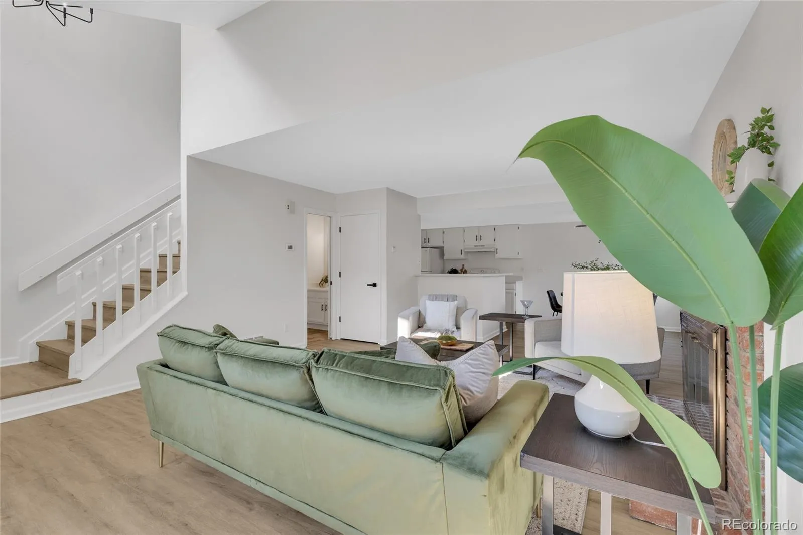 Inside, vaulted ceilings and dramatic floor-to-ceiling windows fill the main living space with light and warmth. Brand-new flooring, fresh interior paint, and updated countertops in both the kitchen and bathrooms give the home a clean, modern feel that’s completely move-in ready. The bright kitchen flows seamlessly into a versatile office nook, ideal for working from home or everyday organization, while the living room’s fireplace adds comfort and character—perfect for Colorado evenings.