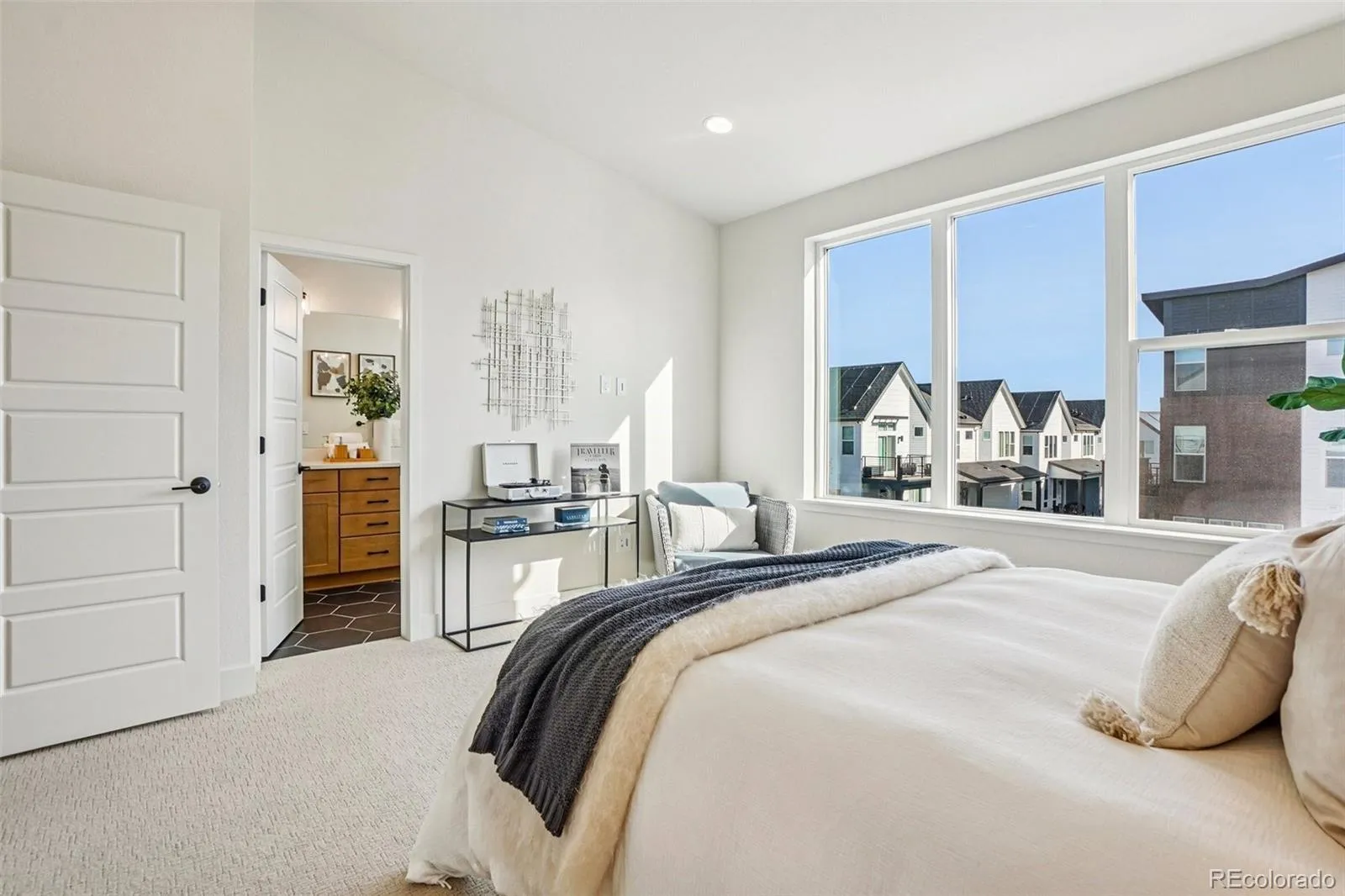 Enjoy the outdoors from the covered front patio overlooking the fenced yard, perfect for pets or peaceful moments outside. Upstairs, you’ll find two secondary bedrooms, a full bathroom, and a well-placed laundry room. The primary suite is a true retreat, complete with vaulted ceilings, expansive windows, and an ensuite bath offering a double vanity, a floor-to-ceiling tiled shower with a bench, and a private water closet.