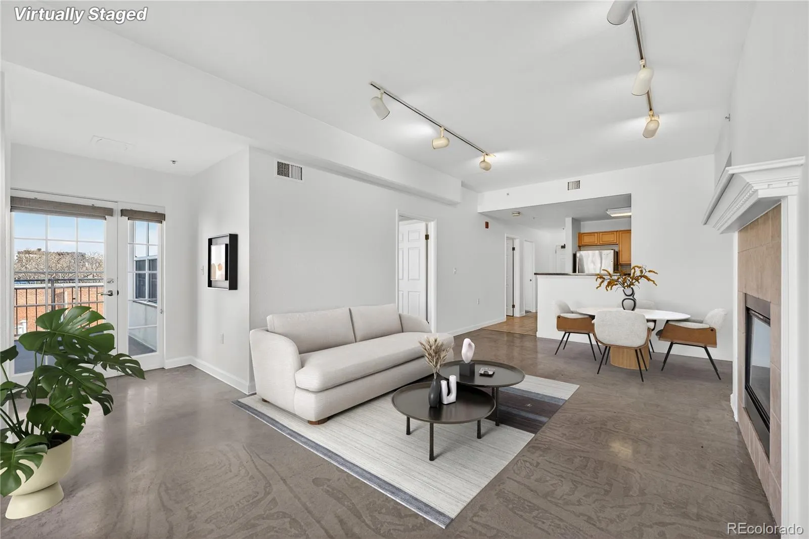 Located in the heart of Denver’s vibrant Uptown neighborhood, this open-concept condo blends style and convenience with effortless city living. As an end unit, it benefits from excellent natural light through multiple windows and shares fewer walls, creating a bright, airy, and private feel throughout. Concrete floors run through the home, offering a modern aesthetic that is both durable and versatile, while a gas fireplace anchors the large living room for cozy evenings at home. Step out onto the balcony to enjoy fresh air and the energy of the neighborhood. The open kitchen features stainless steel appliances and flows seamlessly into the living area, making it ideal for everyday living or entertaining. Two generously sized bedrooms and two bathrooms provide comfort and flexibility, including a primary suite with an ensuite bathroom and walk-in closet. Recent updates add peace of mind, with a new water heater installed in early 2022 and new toilets in both bathrooms as of April 2024. Additional conveniences include an in-unit washer and dryer, a reserved parking space, and fiber internet included in the HOA fees. The location truly shines with fantastic restaurants, bars, and cafes lining 17th Avenue and throughout the Uptown area. City Park and Cheesman Park are just minutes away for outdoor enjoyment, and the central location is ideal for commuting downtown or to nearby hospitals, making this home an exceptional opportunity for urban Denver living.