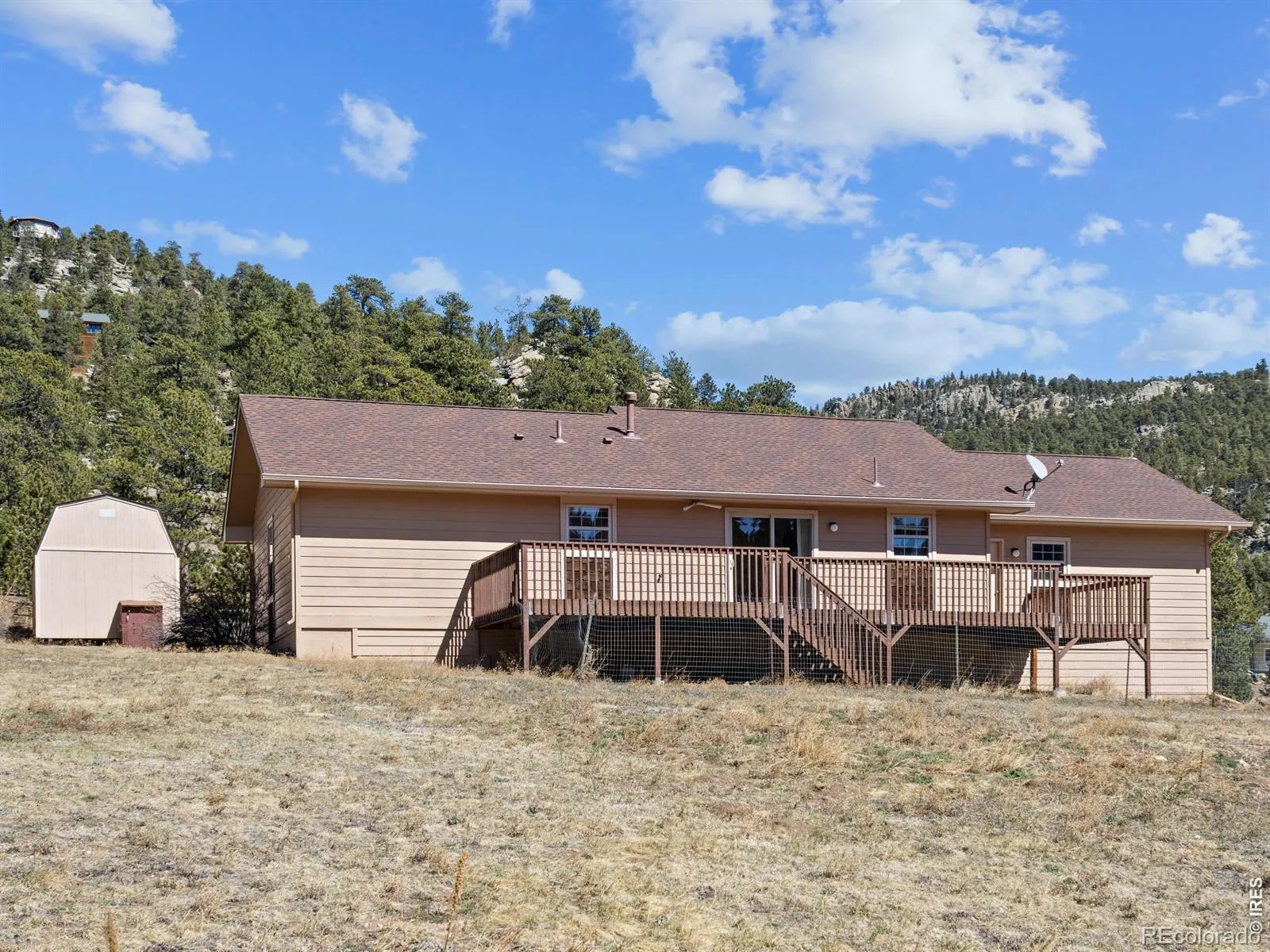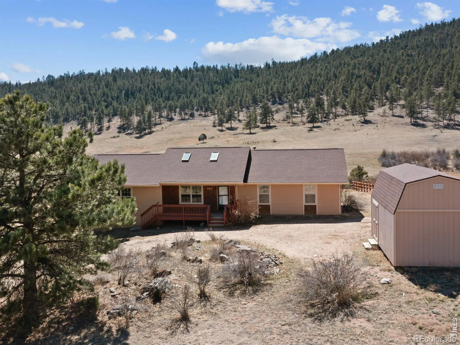 Embrace Colorado mountain living in this spacious ranch-style home on 1 acre just outside Estes Park, where herds of elk and wildlife grace the nearby meadow near Hermit Park. This inviting single-level residence features a generous living room anchored by a stunning river stone gas fireplace with log mantel and hearth, while vaulted ceilings and skylights flood the dining area with natural light. The eat-in kitchen offers both function and charm, and the large primary bedroom provides a private retreat complete with ensuite bath and walk-in closet. Step onto your deck to witness nature’s daily show, from grazing elk to breathtaking mountain vistas. An oversized shed provides ample storage for all your outdoor gear and mountain lifestyle needs. This is Colorado living at its finest-where comfort meets wilderness, all within reach of Rocky Mountain National Park.