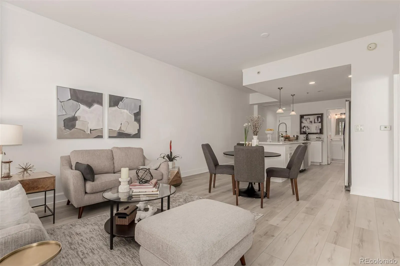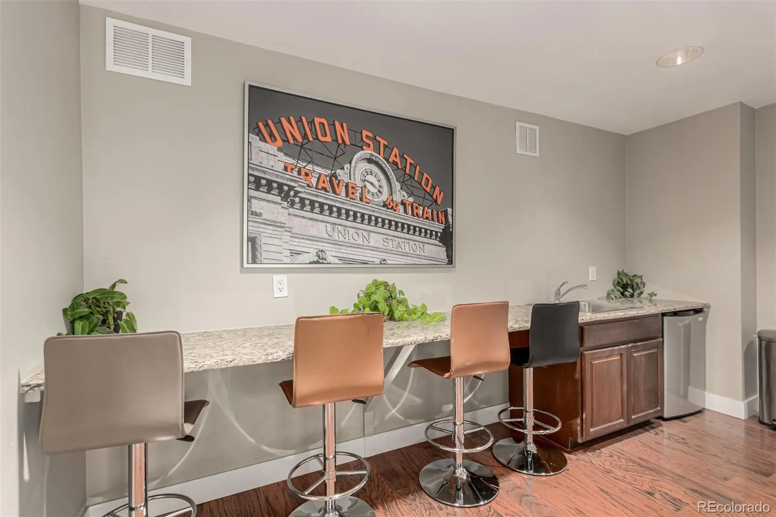 Grant Park Condos, Urban Contemporary Living in the Heart of Uptown! Welcome to this stunning & bright two bedroom and two bath unit. This nicely updated condo with east facing views from the living room, primary bedroom and your own private balcony—ideal for relaxing evenings or morning coffee. Inside, this beautiful unit offers a modern, open-concept layout, a large kitchen with island, white cabinetry, sharp Quartz countertops, stainless steel appliances, gas stove and plenty of space to cook & entertain. The open style great room flow is a comfortable combination of living & dining. The primary bedroom with three windows, an ensuite four-piece bathroom and walk-in closet. The second bedroom has a full-size Murphy bed installed, closet, built-in corner office desk and bookshelves- a wonderful use of space. Additional features include wood flooring throughout and a stackable washer/dryer. Access the 2nd floor for the great building amenities- a large fitness center, spacious outdoor patio and community meeting room. Set in a prime location, across the street from the corner of the building is the local Benedict Fountain Pocket Park. Looking for more close by? Travel south a block over to the close by 19th street row of restaurants and businesses. If that’s not enough, travel up just 2 blocks more to 17th Avenue, which is whole additional corridor of restaurants, shops & stores. Downtown Denver too is very close, just head over west about 5 blocks and you are connected to the newly updated 16th Street with free buses making it easy to enjoy everything the city has to offer all the way to LODO & Union Station.