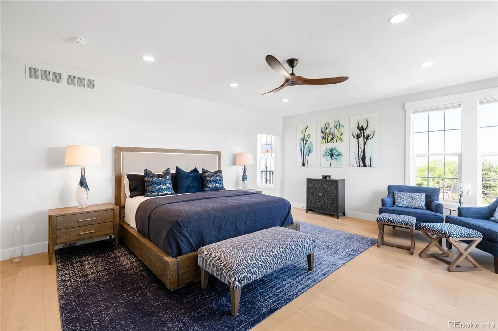 Perched atop a scenic hillside in Hillside Cottages, this model home masterpiece is crafted by esteemed local builder Royal Oak Homes. With unobstructed mountain and city views, this residence is a showcase of elevated living, filled with natural light and refined finishes. The south/east-facing corner lot enjoys premium end placement and privacy. Inside, 8-foot solid core doors, wide-plank engineered hardwoods and designer touches define every space. The gourmet kitchen impresses with Café stainless appliances, a pot filler, vented hood, floating shelves and a statement island. A fenced yard and a covered patio extend off the main level, which also hosts a living room with a sleek fireplace, private office and mudroom area adjacent to the 2-car garage. The sun-drenched primary suite offers a private balcony, spa-like bath and a custom closet. A top-level bonus room with a wet bar opens to an expansive rooftop deck with a fireplace — perfect for relaxing amid panoramic Colorado views.