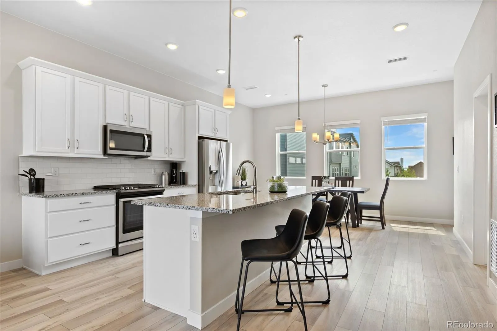 This beautifully designed 3-bedroom, 4-bath townhome offers modern style and exceptional livability near the heart of Denver. Expansive windows frame mountain and city views, flooding each level with natural light and creating a warm, inviting atmosphere throughout. The kitchen serves as the heart of the home, featuring a generous island, gas range, walk-in pantry, and granite countertops—ideal for both daily living and effortless entertaining. An open-concept living area provides seamless flow for gatherings, while private bedroom retreats are thoughtfully positioned on the upper levels. The primary suite delivers spa-like comfort with low entry shower, dual sinks and white quartz countertops, offering a peaceful escape. Additional features include a whole-home water softener, attached two-car garage, low-maintenance HOA, and well-appointed finishes throughout. Ideally located in Denver’s Midtown neighborhood, this home is close to parks, open space, and miles of trails, with local favorites like Early Bird Restaurant and Bruz Brewery just minutes away. This residence perfectly blends comfort, functionality, and convenience for modern Colorado living.