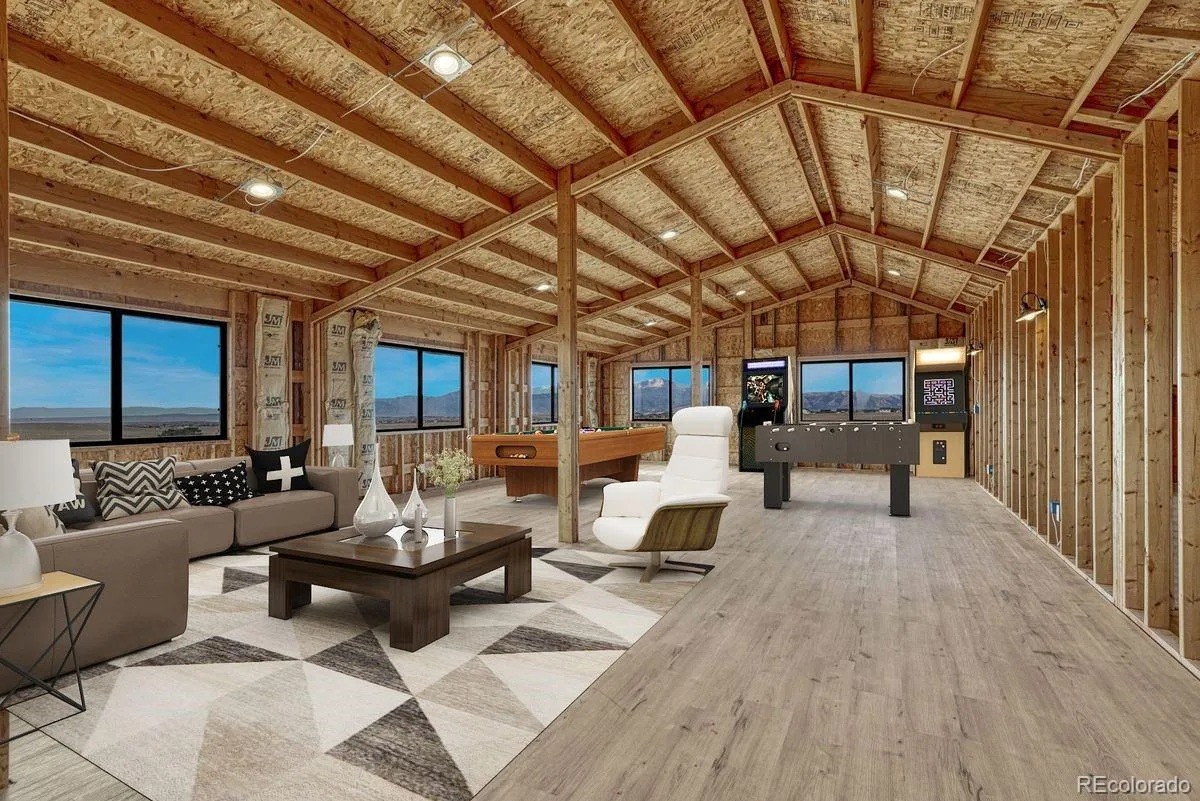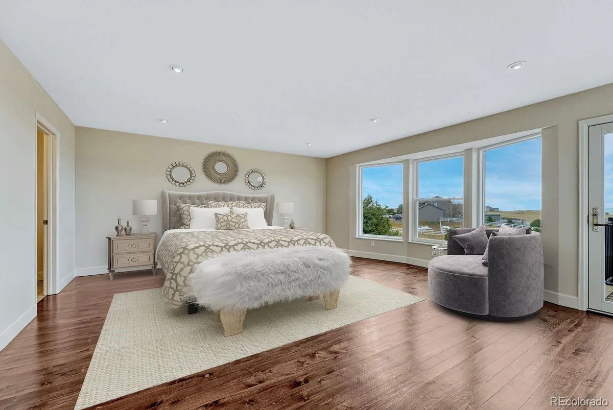 Incredible south Black Forest location with a fully remodeled rancher perfectly positioned on 5 acres featuring tremendous unobstructed views of Pikes Peak, 180 mile views of the surrounding mountain range including the Spanish Peaks. Parking for 10+ vehicles, a 2,700 sq ft barn w/ future guest apartment space. The main level is expansive and open with large windows providing amazing natural light – all centered with views at top of mind, newer Andersen doors, beautiful beetle kill hardwood floors, gas fireplace, vaulted ceilings and walk-out to the 39×11 deck w/ hot tub. Well appointed kitchen w/ granite counters, large island w/ eating space, commercial grade appliances with a full refrigerator and freezer, gas stove and marble backsplash. Main level primary suite w/ two closets, a walk-out to the back deck, bay window, sitting area, hardwood floors and upgraded 5 piece bath w/ standalone tub, double vanity and large shower w/ seamless glass surround. Spacious main level office w/ custom built-ins and French doors. Newer owned solar system and septic system. The two level 2,700 sq ft outbuilding could be used for many uses including barn, workshop, car collection, pickle ball court – the possibilities are endless. Large overhang perfect for covered RV storage. The second level of the barn would make an amazing guest apartment or office space. It is framed, has LVP flooring and is pre-plumbed/framed for a bathroom, large living space w/ kitchen and bedroom, tons of large windows with amazing views of the entire front range. The property is zoned for horses, chickens and outbuildings. No HOA. Fully finished walk-out lower level w/ two additional large bedrooms, a remodeled bathroom w/ double vanity and a large family room. The grounds are lush meadow and ponderosa pines providing privacy to the east.