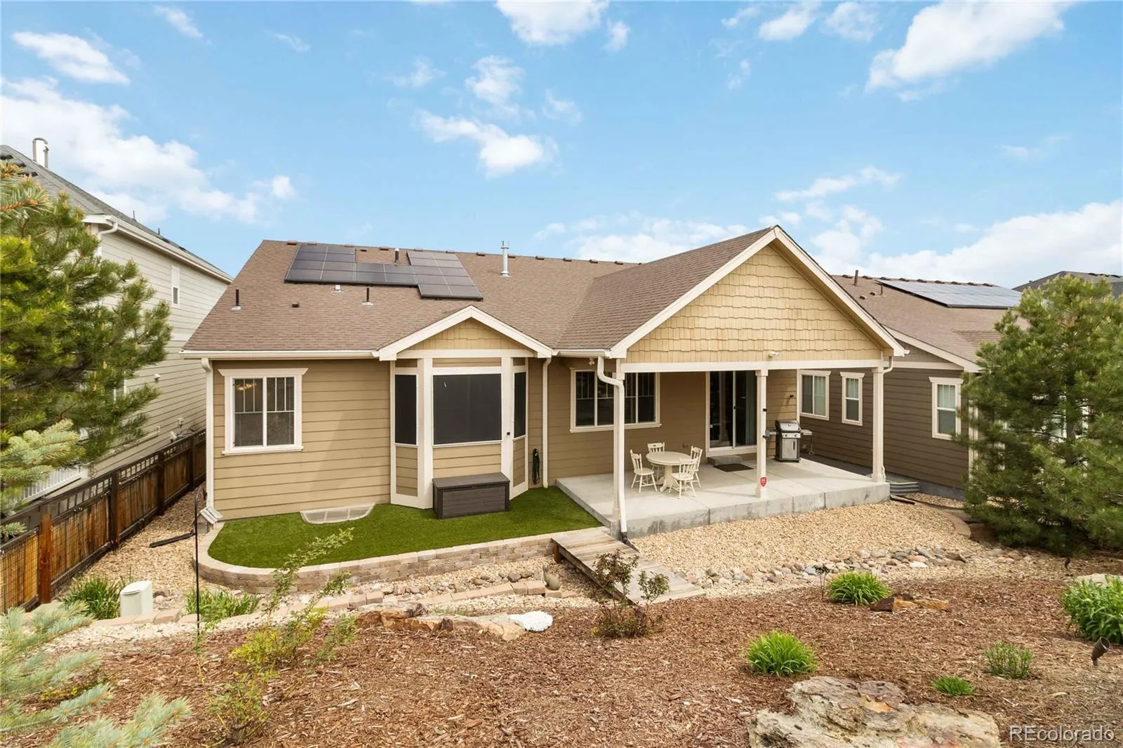 Additional highlights include a three-car oversized garage, recently installed solar system for energy efficiency, full unfinished basement with room to expand, and a low-maintenance xeriscape yard. The serene backing-to-open-space setting provides privacy, peaceful views, and a rare outdoor connection.