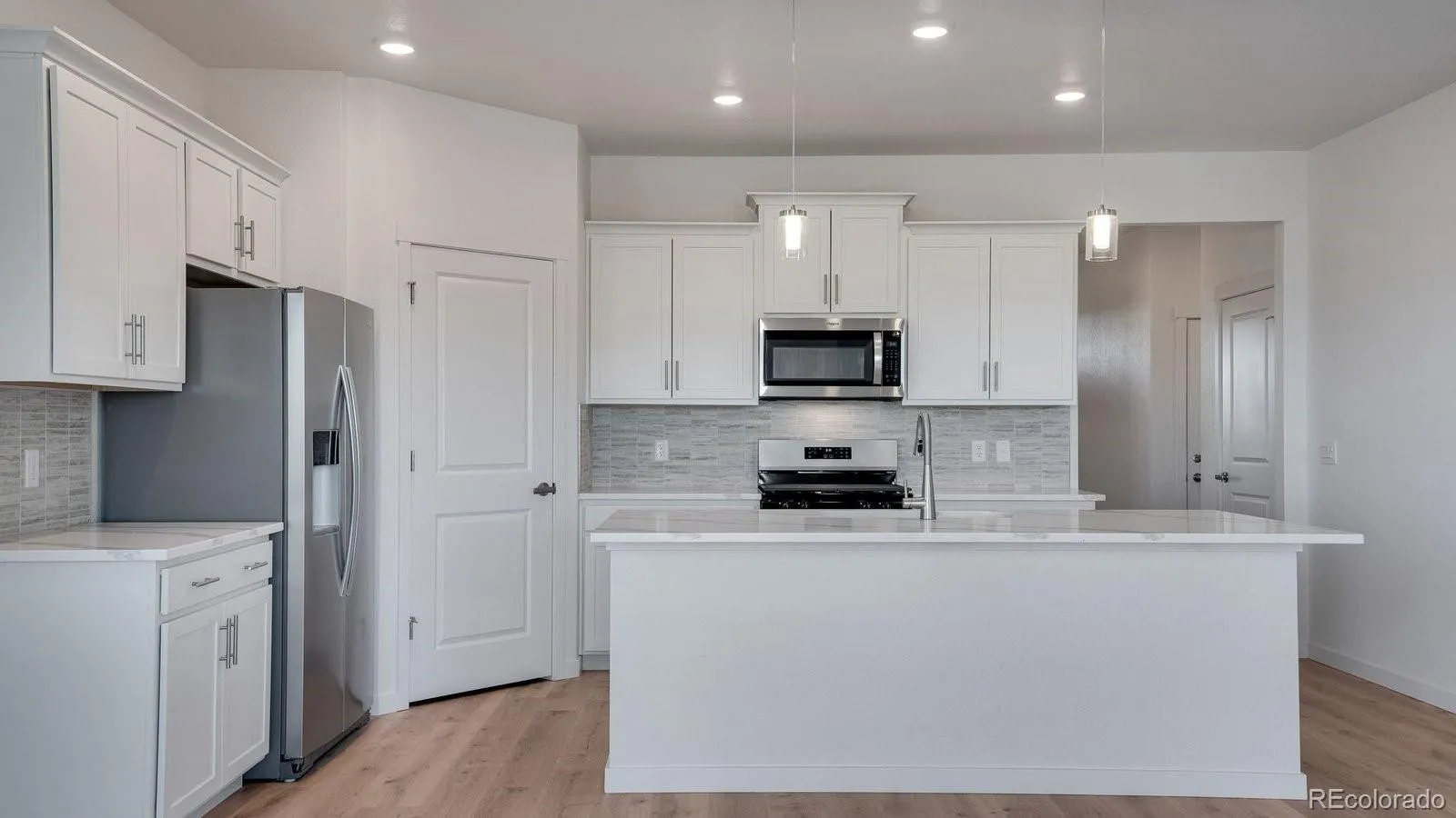 Welcome to this stunning ranch home, designed for both comfort and style. Featuring an open layout with beautiful finishes, this home boasts a spacious main level complete with white cabinetry, a large kitchen island, quartz countertops, and a walk-in pantry, perfect for cooking and entertaining. The kitchen seamlessly flows into the living area, where a cozy tile fireplace adds warmth and charm. The main-level primary suite offers a peaceful retreat, complete with an en-suite bath, a large walk-in closet, and plenty of space to unwind. With hard surface flooring throughout most of the main level, the home feels both modern and practical. Step outside to enjoy the covered front porch or the inviting covered back deck backing to a greenbelt—ideal spots for relaxing or entertaining year-round. The home also includes a 3-car garage, ensuring ample space for vehicles and storage. Both the front and rear yards are beautifully landscaped, providing an inviting outdoor environment. Equipped with a smart home package, A/C, and stainless steel appliances, including a gas range, this home offers both convenience and luxury. With attention to detail and a focus on functionality, this ranch home is the perfect place to call your own.***Estimated Delivery Date: March. Photos are representative and not of actual property***