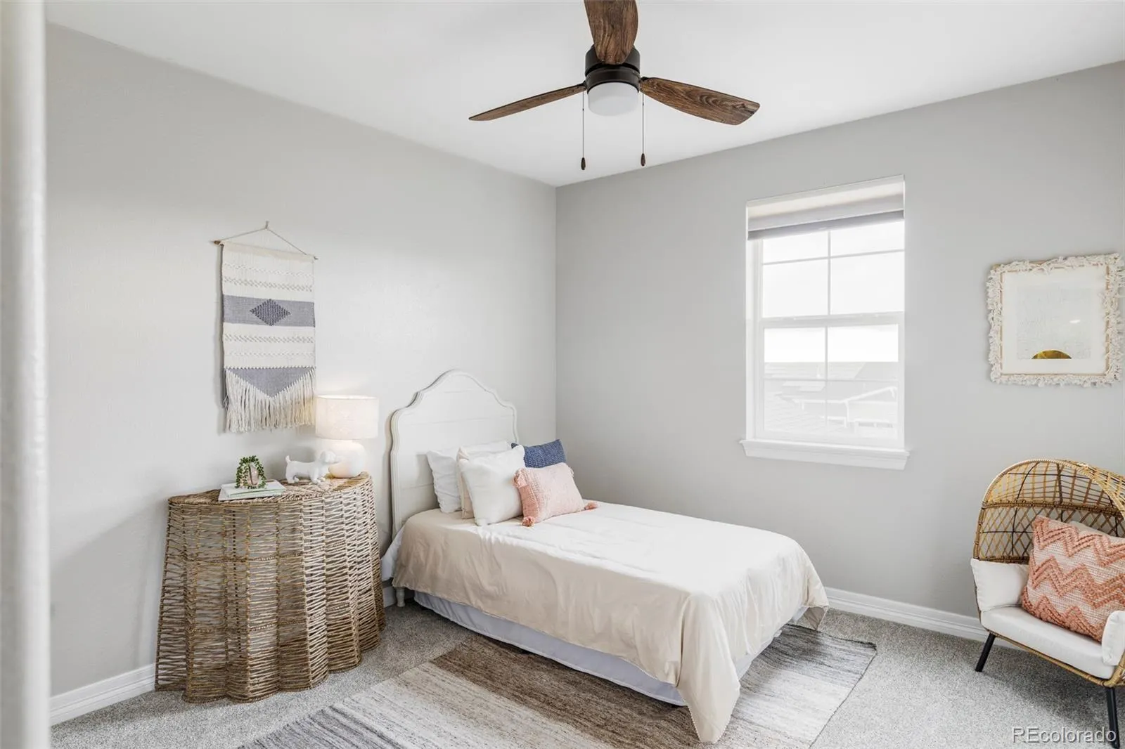 The chef’s kitchen anchors the home with a generous island, upgraded appliances, and seamless connection to the dining and living spaces. A dramatic three-panel sliding glass door opens to a covered outdoor living area, creating a true indoor-outdoor experience perfect for Colorado evenings and gatherings.