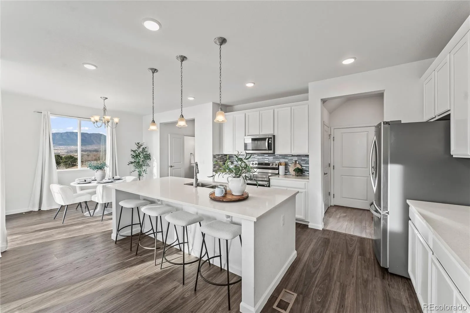 Start the New Year with a home that truly sets the standard. Welcome to 867 Marine Corps Dr, an exceptional end unit residence built in 2018 that blends modern design, thoughtful upgrades, and the most breathtaking and stunning views on the market, featuring a 210 degree unobstructed mountain panorama of Pikes Peak, Cheyenne Mountain, Black Forest, the U.S. Air Force Academy, and Cathedral Rock. This is not just a view, it is a daily experience. With 3 bedrooms, 3 bathrooms, and 2,592 square feet, this 2 story home with a walk out basement delivers daily comfort and long term value in a convenient location. The moment you enter, the home feels open, bright, and welcoming, anchored by the great room with soaring 18 foot ceilings, a gas fireplace, and abundant natural light. The layout flows into a spacious dining room and out to the covered deck, creating a perfect setting for entertaining and daily living. The large kitchen features stainless steel appliances and generous workspace. The current electric stove can be converted, and seller will install gas stove prior to closing if buyer prefers. The primary bedroom offers a private retreat with an additional seating area ideal for a reading nook or office. Updates include newer luxury vinyl plank flooring throughout the main living areas and newer carpet on the stairs. The walk out basement provides future potential, pre wired with a 20 amp circuit near the southwest wall, pre plumbed for an additional bathroom, and space to add another bedroom. Additional upgrades include an Aquasana whole house water filtration system, HVAC air scrubber, and a centrally monitored smoke detector system that alerts Monument Fire Department through Xfinity Home Security, along with door and window sensors. A two car attached garage completes the home. Located near the Jackson Creek Parkway shopping center, quick access to I25, and the Air Force Academy. Homes like this are rare. This is a place to love, invest, and build your future.