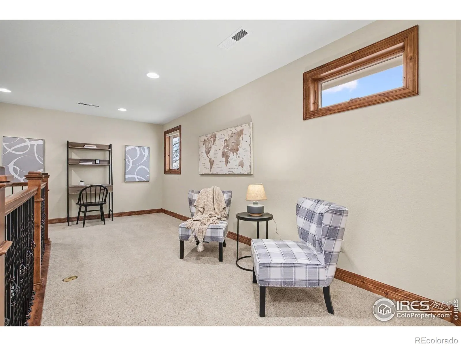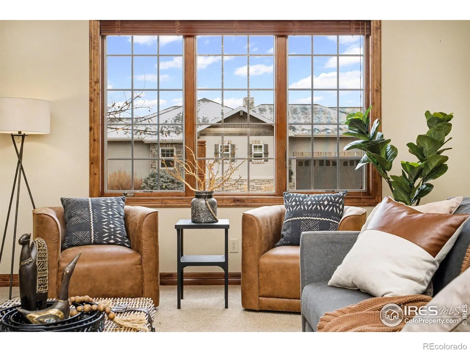 Built for an active Colorado lifestyle, this luxury home in gated Overlook at Mariana features an oversized RV garage and effortless main-level living- offering a true “stay & play” or “lock & leave” experience. Just minutes from golf, trails, and mountain recreation. This 3-bedroom, 4-bath home offers an exceptional open floor plan, vaulted ceilings, and quality finishes throughout. The oversized (1107 sqft) 3-bay attached garage includes an RV bay, perfect for RV, boat, or recreational storage.The main level is designed for easy living and entertaining. A dramatic double-sided stone gas fireplace connects the kitchen/dining with the living room, which boasts vaulted and beamed ceilings. The open kitchen includes wood floors, a large island, pantry, eat-in dining space, and gas stove. Main floor also includes a spacious primary suite with luxury bath and huge walk-in closet, a large laundry room with sink and cabinetry, and an additional bedroom or office with its own full bathroom. Upstairs offers a loft or office, private bedroom and balcony with mountain views and full bathroom. Unfinished basement provides excellent storage or future expansion. Additional features — 2 central A/Cs & high-efficiency furnaces, double-pane windows, safety storm doors, oversized RV/boat garage. The home lives like a patio home with a low-maintenance yard, sprinkler system, and private patio. Perfect home for those who travel or want minimal upkeep. Situated within a gated, “Stay & Play” community offering walking trails, common areas, and a serene setting close to Mariana Butte Golf Course, lakes, and Northern Colorado recreation. A rare blend of custom quality, main-level living, and true lock-and-leave convenience in Northern Colorado. Conveniently positioned for exploring Northern Colorado, with scenic drives to Fort Collins or Longmont (30 min each), Estes Park (40 min), Boulder (50 min), and Denver (approximately 1 hour). See Video Walk-through.