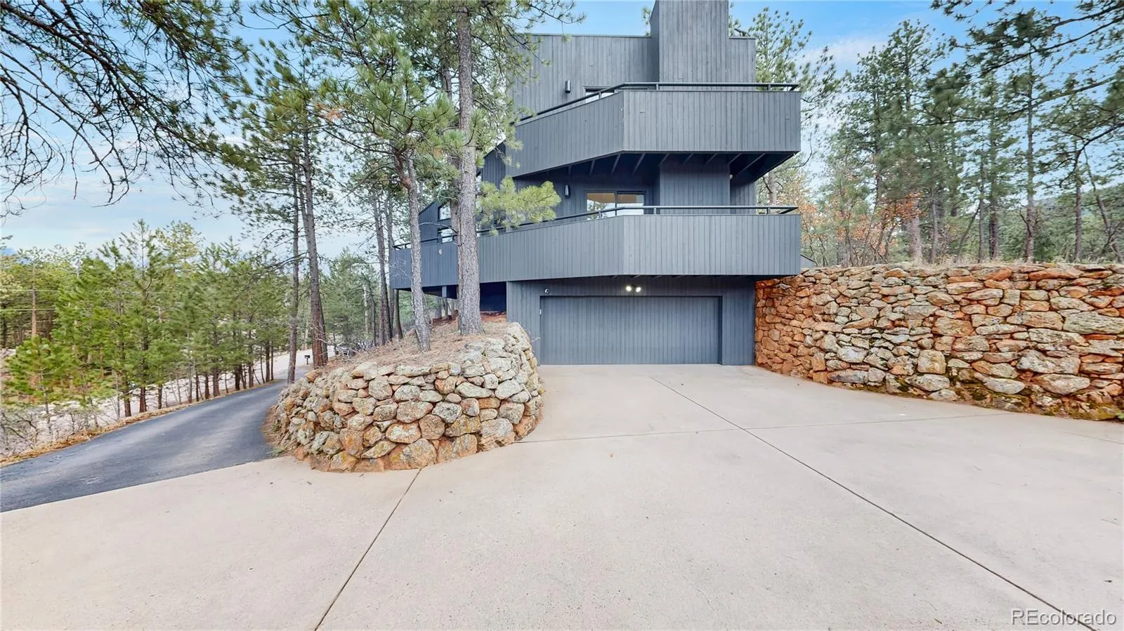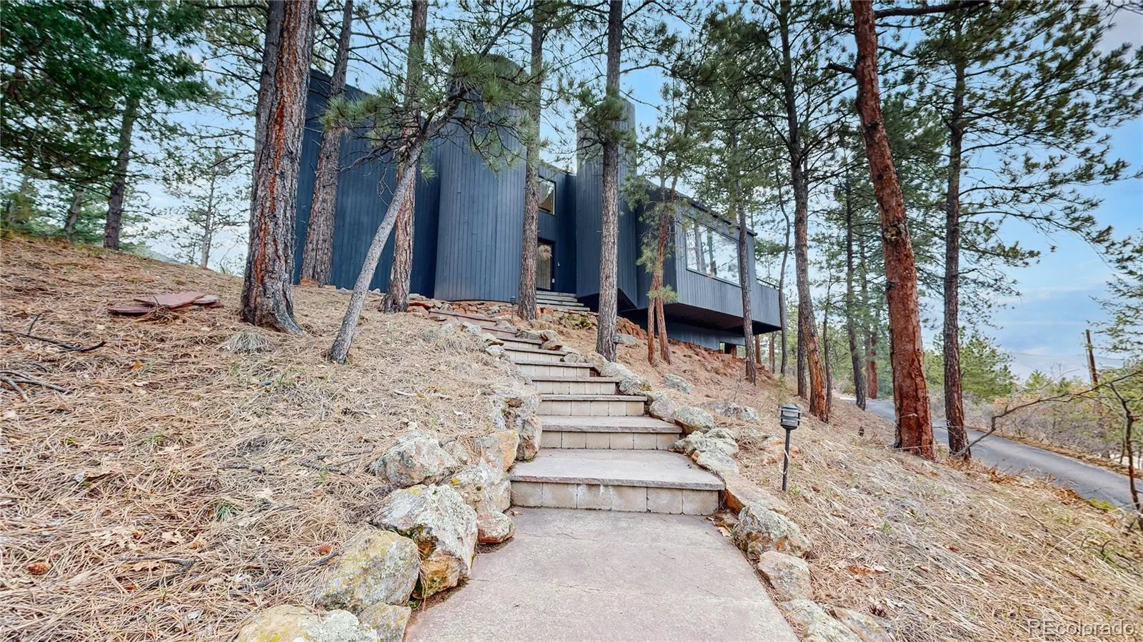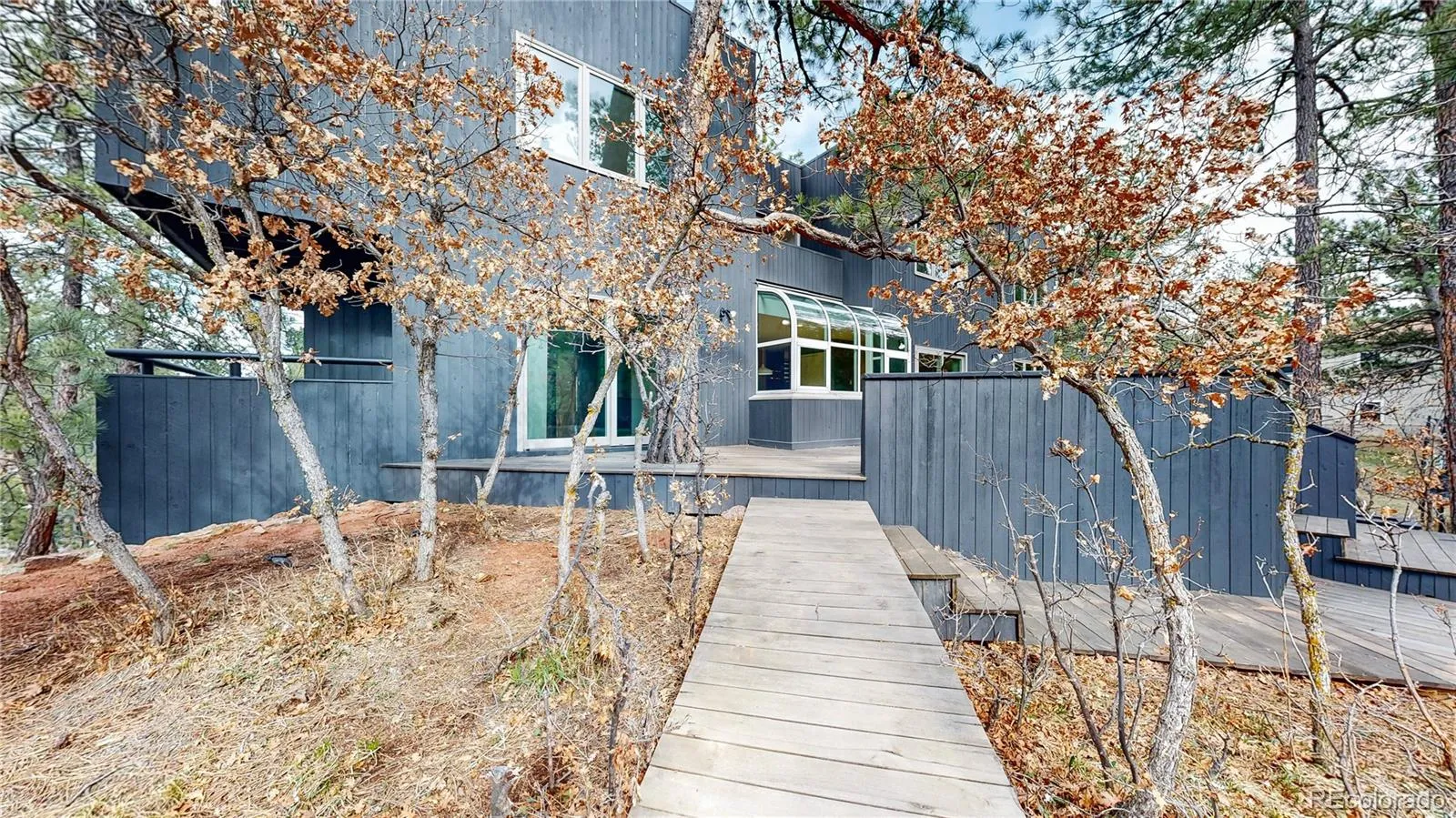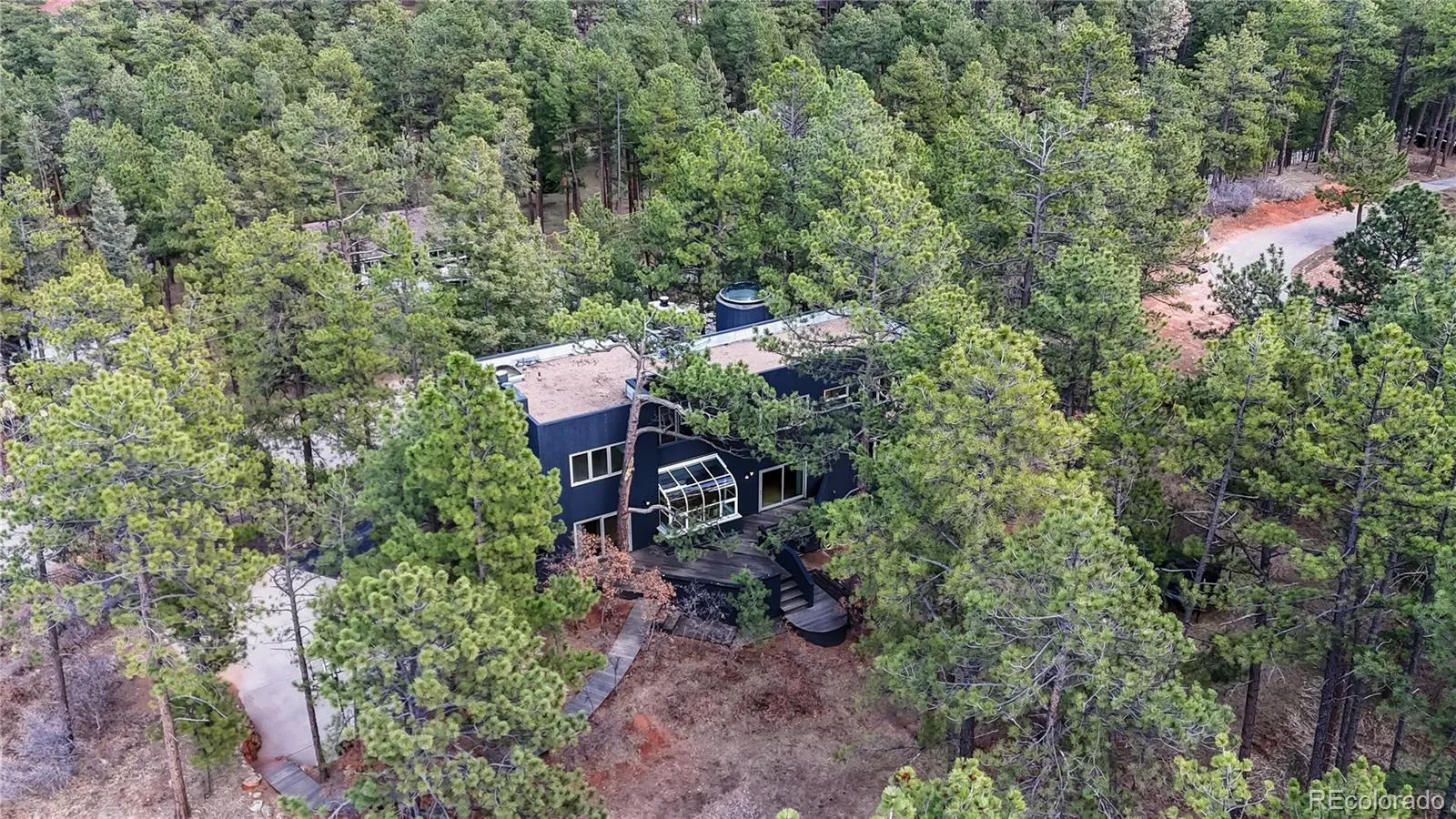Welcome to this stunning contemporary custom-designed 5-bed (or 4+ office), 4-bath, 3,890 sq ft home, perfectly positioned for privacy and tranquility among towering Ponderosa pines. Breathtaking views from nearly every window showcase sweeping mountain, red rock, and Pike National Forest views, while vibrant sunsets paint the sky. Perched high on the lot, this light-filled home offers an open, airy layout ideal for entertaining. The spacious kitchen features hardwood floors, an oversized island with seating for six, a cooktop with a grill, a pantry, and a breakfast nook—just steps from an impressive 10′ Four Seasons curved glass greenhouse. The kitchen, dining, and family rooms flow seamlessly onto a massive Brazilian redwood deck. With five decks and a patio, you’ll always find the perfect spot in the sun or shade. The main level boasts a family and living room—each with a fireplace, a private office, a formal dining room, and a powder bath. A captivating multi-level open spiral staircase showcases an incredible 80+ year old Elephant Foot Ponytail Palm, perfectly situated beneath an 8′ diameter skylight that floods the space with natural light. The primary suite offers a wood-burning fireplace, two private decks, and a spa-like five-piece bath with a soaking tub under a skylight. Two additional bedrooms and a dual-sink full bath complete the upper level. The walk-out lower level features a fourth bedroom, full bath, rec room, & wine storage. Recent upgrades include a new security system, fire mitigation, electrical panel, water heater, exterior paint, freshly paved driveway, and secured mailbox. Ideally located near Perry Park Country Club, “Big D” Open Space, horse stables, hiking/biking trails, and Douglas County’s Sandstone Ranch Open Space. Enjoy abundant wildlife, deer, turkeys, and colorful hummingbirds in this exceptional natural retreat! Secluded but not isolated, only 20 mins to Castle Rock and 40mins to DTC or CO Springs.