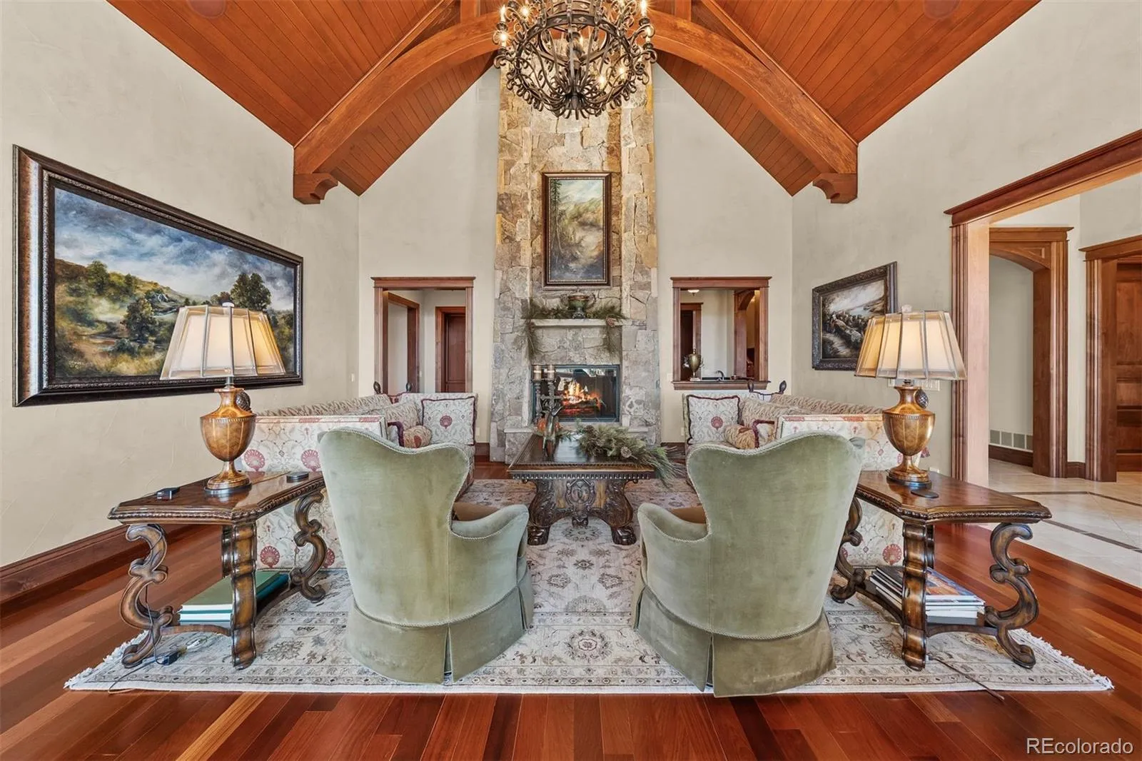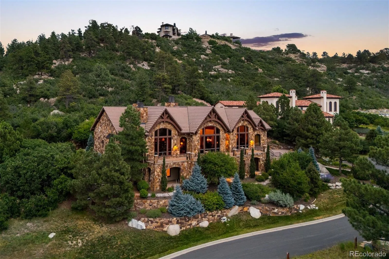 Commanding rare, sweeping views from the Sangre de Cristo Range to Mt. Evans, this 5 bedroom | 9 bathroom estate, regally perched above the gated Village at Castle Pines community, is magnificent in both scale and design. Unfolding around a breathtaking 2-story great room, vaulted ceilings, hand-hewn wood beams, and natural Colorado stone set a tone of grandeur for this impressive home. Designed to entertain, the comfortable family room, with access to the amply sized back patio and yard, offers a seamless transition into the kitchen which is anchored by an oversized island, Sub-Zero refrigerator, Wolf double ovens, and range. Gatherings are further enhanced by a wet bar, formal dining room, and butler’s pantry with dedicated appliances. The fully wood-paneled executive office is fit for a CEO, and the main level is completed by a spacious primary bedroom and spa-like bathroom, ideally located guest suite, second office, two powder rooms, laundry room, and 4-car garage. A destination of its own, the walkout lower level includes a recreation room and bar, soundproof theater, and an extraordinary, climate-controlled wine cellar paired with an adjoining tasting room, both crafted for collectors. An en suite bedroom, workout room with sauna and shower, bonus room, powder room, and abundant storage complete this level. The upstairs is its own retreat with a loft and two additional bedrooms complimented by en suite baths, each with heated floors. The thoughtfully engineered 6-inch steel-reinforced concrete driveway with snowmelt system on the downhill approach and front steps is a plus. Outside, incredible living spaces abound whether you’re stargazing by the fire pit on the back patio, playing in the yard, winding through the flagstone paths, dining on the lower level porch, or taking in the spectacular mountain views from the front terrace. Simply put, this exceptional estate is a residence like no other and offers a phenomenal setting for year-round Colorado enjoyment.
