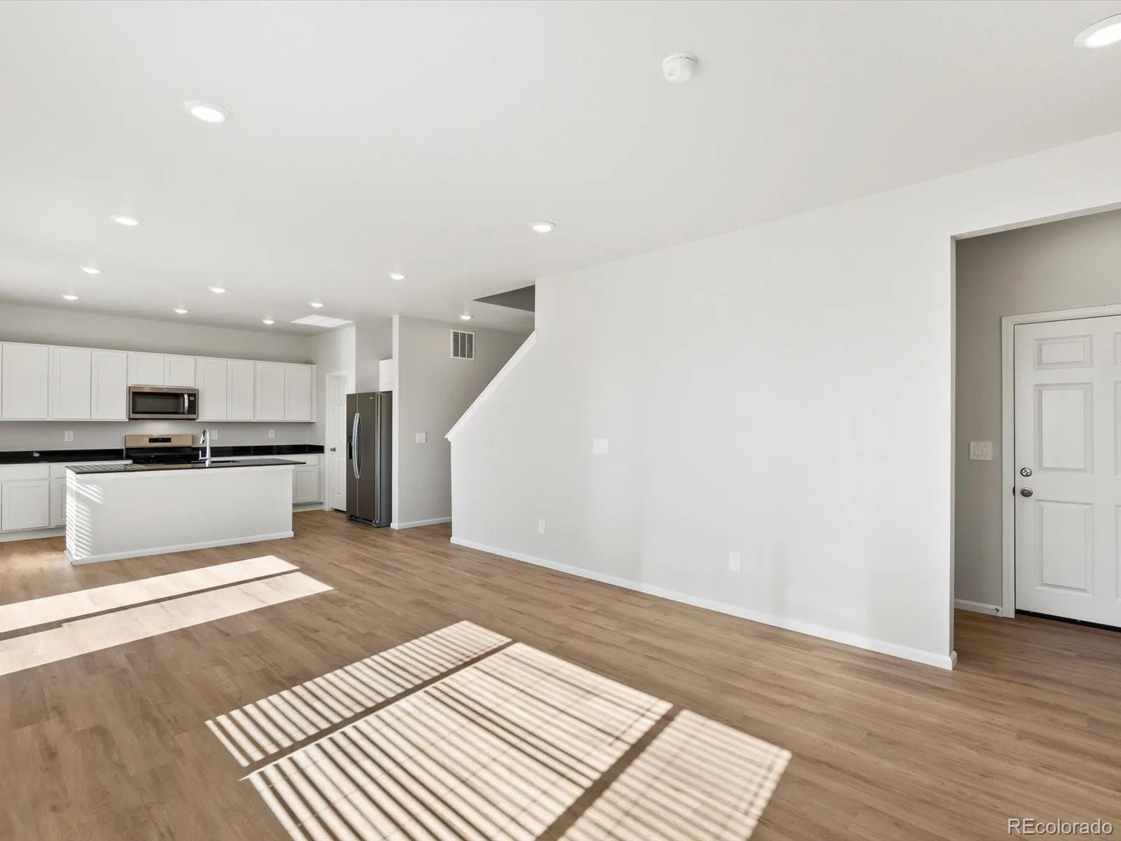 Open concept kitchen with granite countertops and white cabinets!