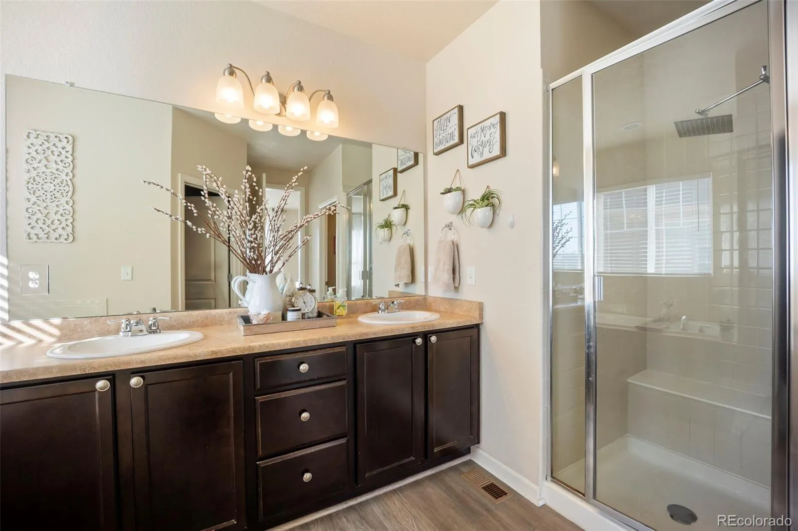 Step inside to a bright and open main level that includes a welcoming family room with a cozy fireplace and beautiful hardwood-style flooring. The kitchen flows seamlessly into the dining and living areas, ideal for hosting gatherings and everyday living. Home showcases stainless steel appliances, granite countertops, ample cabinetry with crown molding, stylish light fixtures & plantation shutters throughout the main level.