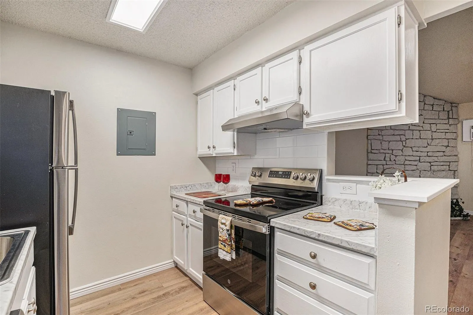 Inside, vaulted ceilings and skylight elevate the spacious living area, where new laminate flooring and a cozy wood-burning fireplace set a warm, inviting tone. The updated galley kitchen features sleek stainless steel appliances, fresh white cabinetry, marble-look countertops, and a skylight that fills the space with natural light. The adjacent dining area flows seamlessly into the living room, perfect for both entertaining and everyday living.