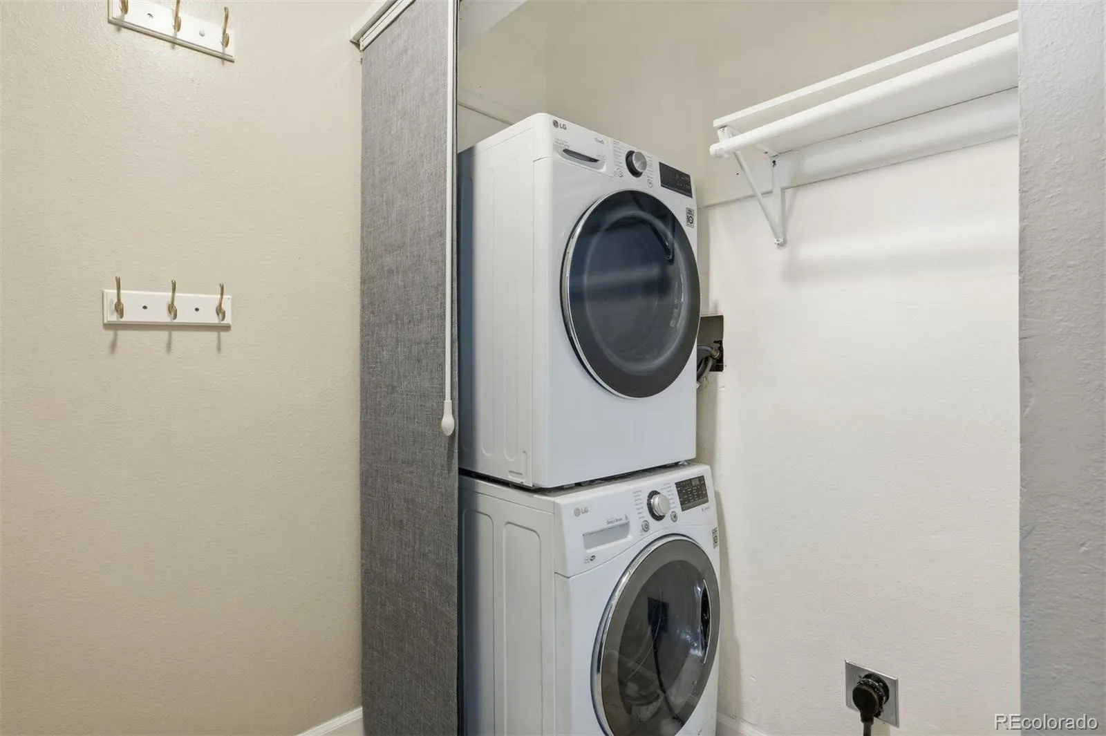 The layout includes two spacious bedrooms, offering flexibility for guests, a home office, or everyday living. The primary suite is filled with natural light and features dual closets and a private 3/4 en-suite bath with granite countertops and a glass-enclosed shower. Multiple storage closets throughout the home add everyday convenience, while a stacked washer and dryer, less than five years old, are conveniently located near the entry.