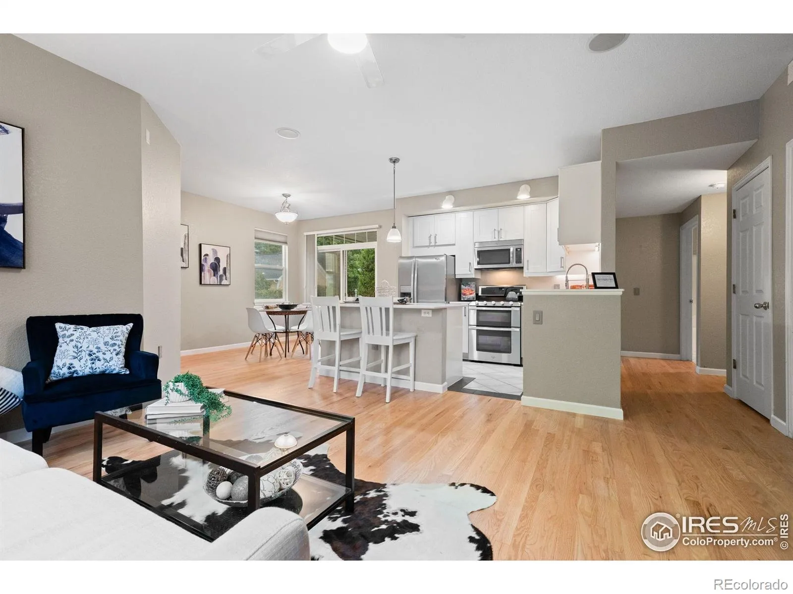LOCATED IN SOUTHWEST LONGMONT, EASY ACCESS TO BOULDER. Sunny ground-floor corner unit with excellent natural light from 3 of the four walls. Not a stair or a step in this freshly updated 3-bedroom and 2-bath condo. The updates include modern white kitchen cabinets and newly refinished hardwood floors throughout; no “lived-in” carpeting to deal with. Open and easy to entertain between the kitchen, dining, and living areas. The master bedroom is spacious, with ample closet space, and is light and bright with a crawl space in the closet. The master bath features a tub/shower surround and a large vanity with ample storage space. The second bedroom has a large walk-in closet, and with lots of natural light, the third bedroom can also be used as a home office for the work-from-home professional. The main bath also features a tub/shower surround and a spacious vanity. The detached single-car garage is just steps away from the unit and includes shelving for additional storage-located in the highly desired St. Vrain Valley School District. The unit also includes an ample, fenced outdoor space, landscaped with low maintenance in mind, that provides a nice, private place to entertain in warmer months. Close to shopping at Village of the Peaks, Whole Foods Market, and Target. This lovely home is ready to move in and enjoy!
