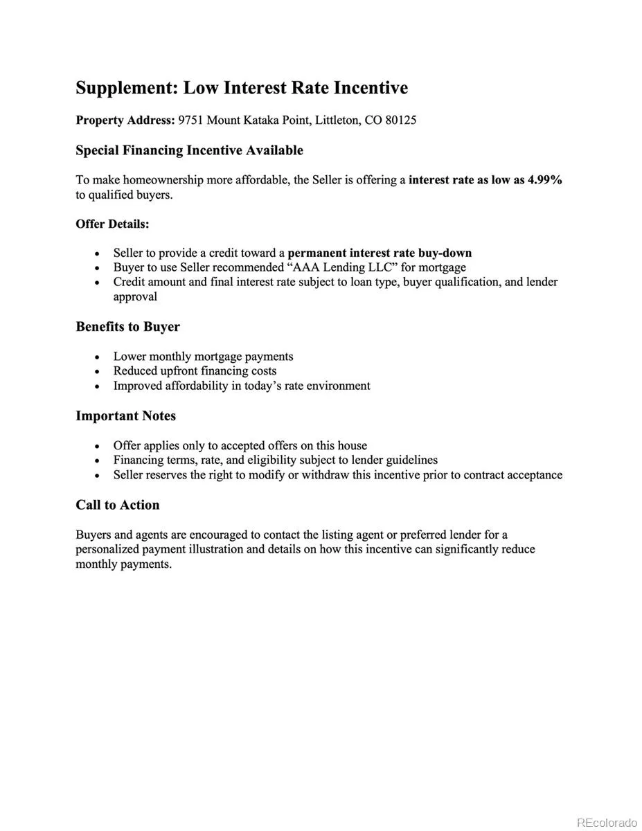 Low interest rate incentive available. Seller may offer buyer credit toward a lender-approved interest rate buydown. Rates as low as 4.99% for well-qualified buyers may be available when using seller-recommended mortgage broker, subject to lender approval, underwriting, loan program, and market conditions. Buyer must qualify. Rate not guaranteed.
