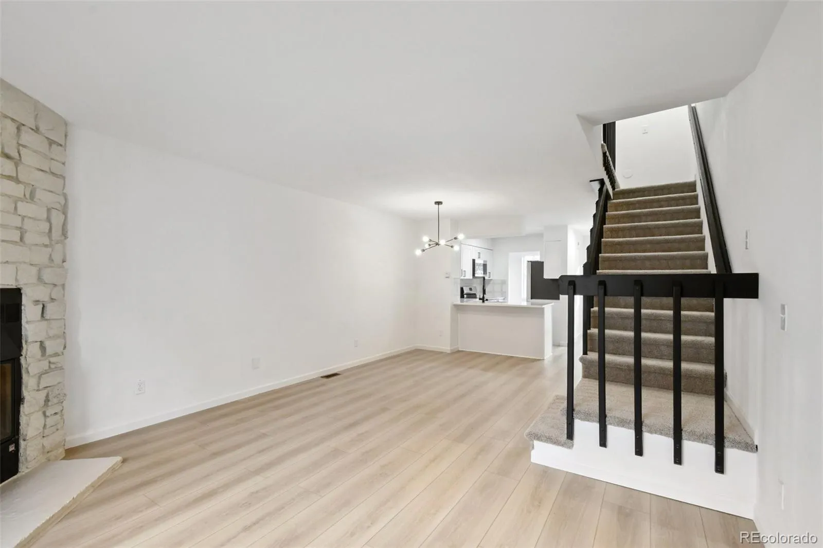 Welcome to this beautifully fully remodeled townhome offering modern finishes, thoughtful upgrades, and an exceptional location directly across from the community pool. From the moment you arrive, you’ll appreciate the charming exterior with stone accents, a private entry, and assigned parking spaces steps from the front door. The main level features new luxury vinyl flooring, fresh interior paint, and an open, functional layout. The living room is anchored by a stone-surround fireplace, creating a warm and inviting focal point. Sliding glass doors bring in natural light and open to a private, fenced yard with patio, perfect for outdoor dining, pets, or relaxing. An exterior storage closet adds valuable convenience. The completely updated kitchen showcases white shaker cabinets, quartz countertops, stainless steel appliances, a full-tile backsplash, and modern lighting. A large pantry located just off the kitchen provides excellent storage and functionality. The kitchen flows seamlessly into the dining and living areas, ideal for entertaining and everyday living. Upstairs, the primary bedroom features high, lofted ceilings, a large closet, and a private ensuite bathroom that has been fully remodeled with contemporary finishes. The second bedroom offers high ceilings and generous closet space. Additionally, both bathrooms have been fully renovated, the home includes washer and dryer hookups, all-new paint throughout, a new electrical panel, and new carpet in bedrooms and stairs. Enjoy easy access to I-225, the Aurora Town Center, local parks, grocery stores, and public transit, including light rail stations and bus stops. This move-in-ready home combines modern updates, private outdoor space, and an outstanding location in well-cared for community—an exceptional opportunity.