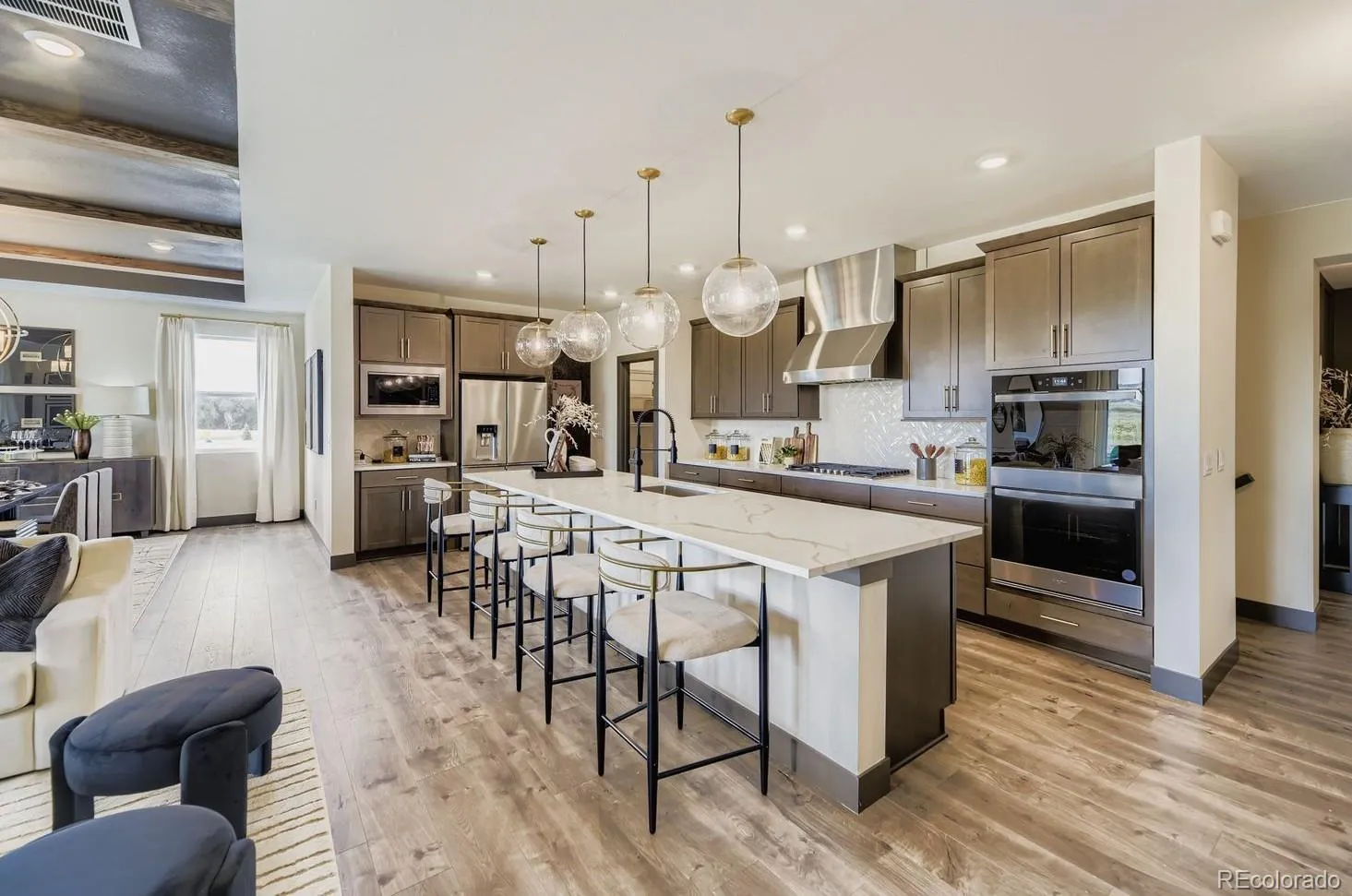 Brand new ONE-STORY home located in a quiet cul-de-sac to be completed in FEBRUARY! This stunning ‘Summit one-story home perfectly blends luxury, comfort, and functionality with a spacious open-concept layout that offers three generously sized bedrooms and two full baths on the main level, designed for effortless living and entertaining. Step inside and you’ll find a gourmet kitchen that’s as beautiful as it is functional, featuring timeless antique white cabinetry, quartz countertops, a stylish herringbone mosaic tile backsplash, and Whirlpool stainless steel appliances—including a gas cooktop, hood, double oven, dishwasher, and built-in microwave. The owner’s suite serves as a private retreat with a spa-inspired 5-piece bath, complete with dual vanities, a freestanding soaking tub, and an oversized walk-in closet. The finished basement expands your living space with a large recreation room, two additional bedrooms, and a Jack-and-Jill bath—ideal for guests, hobbies, or a home office. Step outside to the extended covered patio and take in breathtaking views of Parker’s rolling hills, the perfect backdrop for relaxing evenings or weekend gatherings. Located in the sought-after Looking Glass community, you’ll enjoy a serene neighborhood setting just minutes from downtown Parker, I-25, Park Meadows, and the Denver Tech Center. This home perfectly captures the best of Colorado living—modern luxury and timeless comfort in a picture-perfect setting. Don’t wait to schedule your showing today! * Please note that the interior photos provided are the ‘Summit’ model home, and not the actual home.